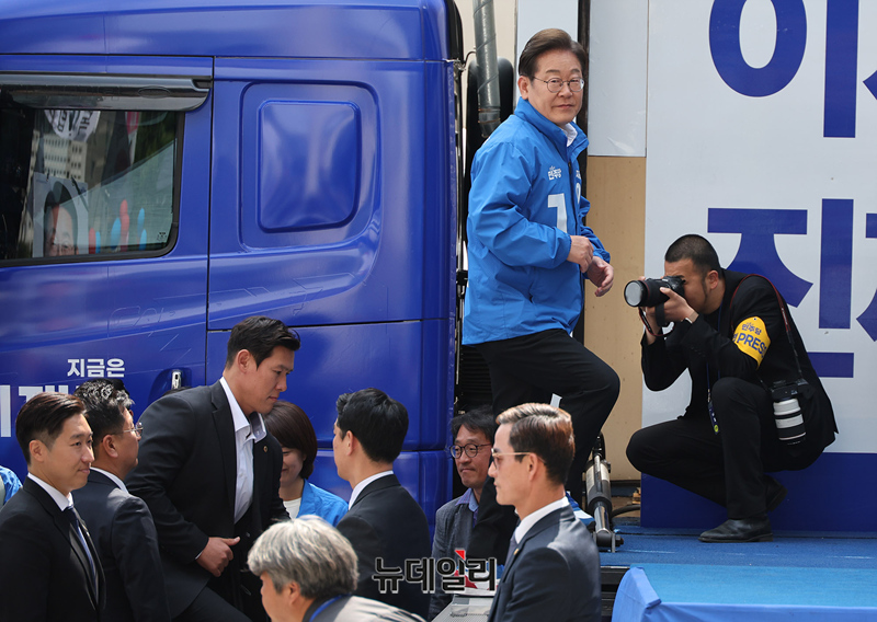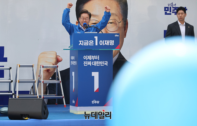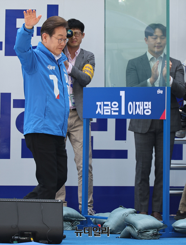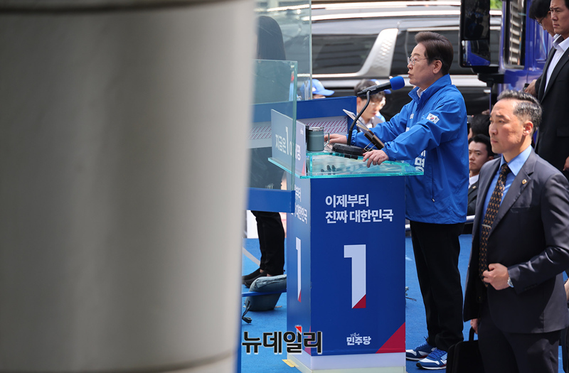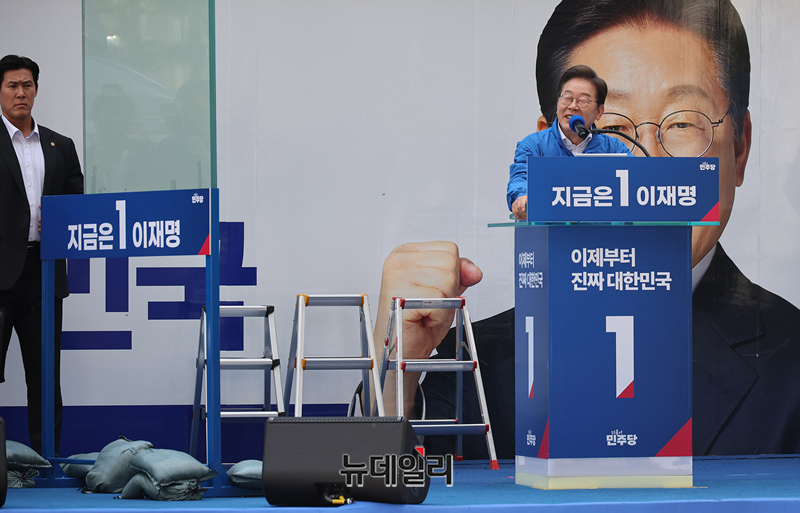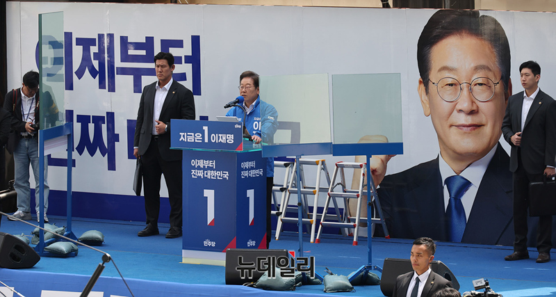 이재명 더불어민주당 대선후보가 19일 오후 서울 용산역 광장에서 열린 집중유세에서 방탄유리가 설치된 연단 위에서 지지호소를 하고 있다.