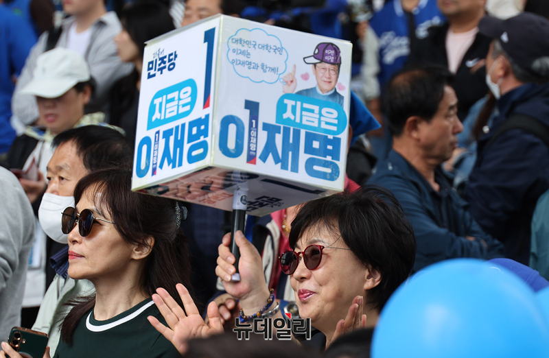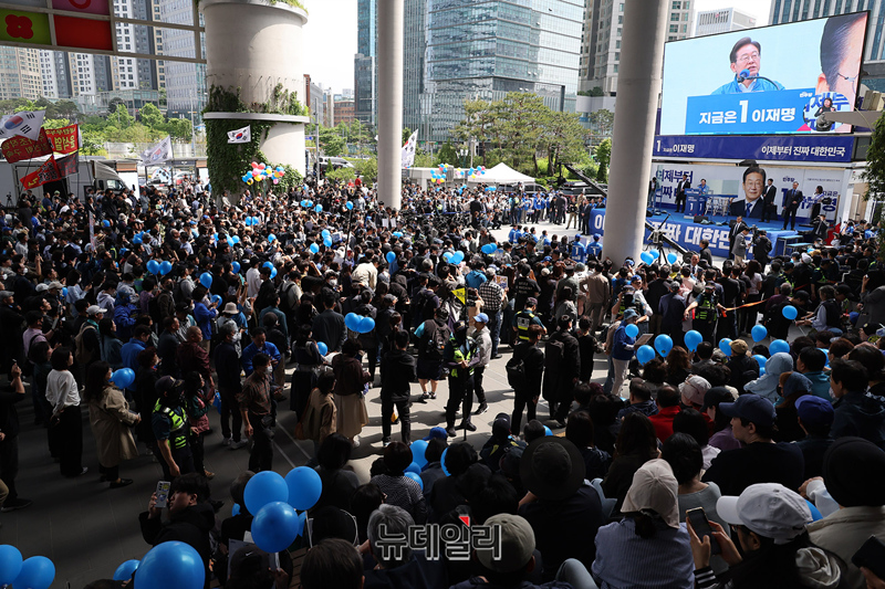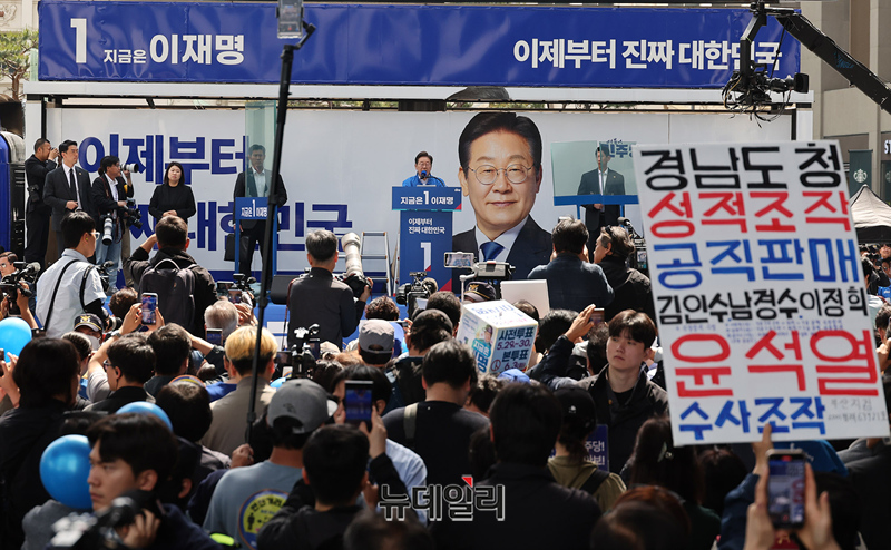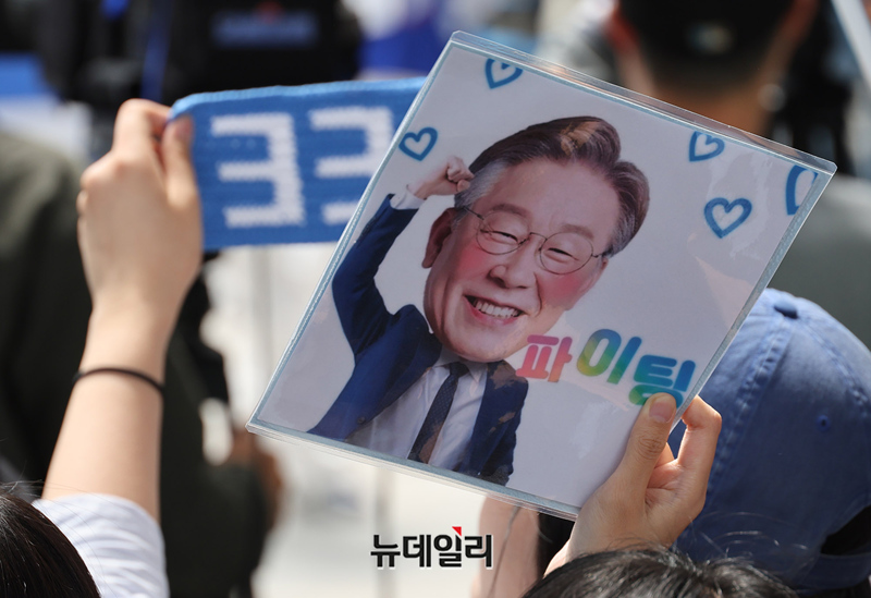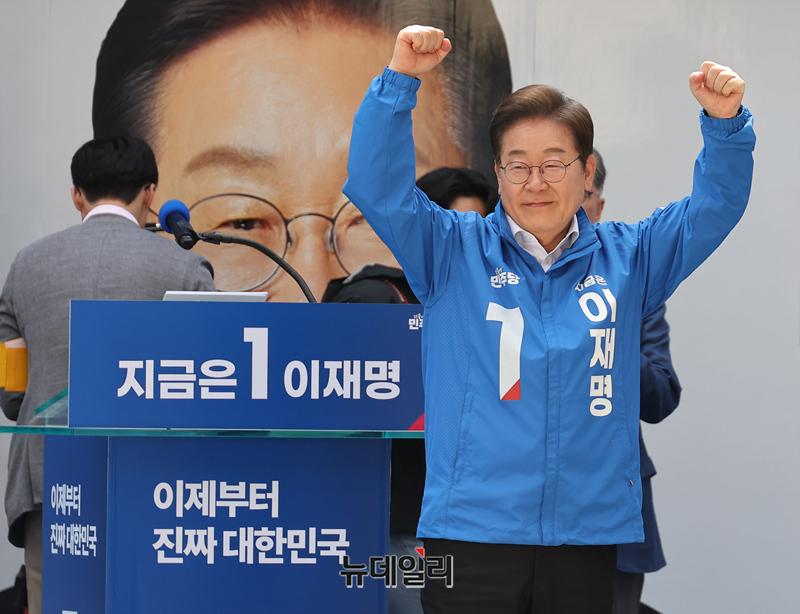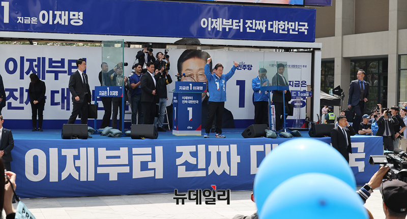 이재명 더불어민주당 대선후보가 19일 오후 서울 용산역 광장에서 열린 집중유세에서 지지호소를 하고 있다.