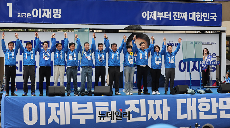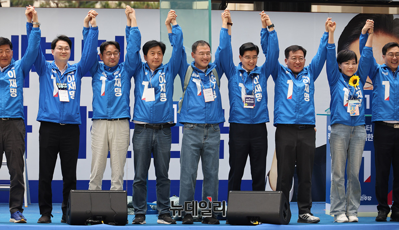 국민의힘을 탈당하고 민주당에 입당한 김상욱 의원이 19일 오후 서울 용산역 광장에서 열린 이재명 더불어민주당 집중유세에서 민주당 의원들과 손을 잡고 지지자들에게 화답하고 있다.