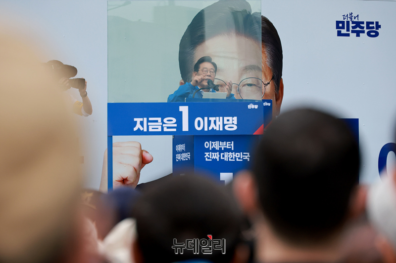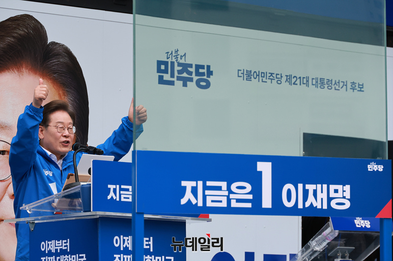 이재명 더불어민주당 대선후보가 19일 서울 영등포구 타임스퀘어 광장에서 열린 유세에서 지지를 호소하고 있다.