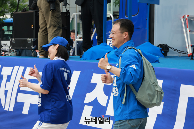 국민의힘을 탈당해 더불어민주당에 입당한 김상욱 의원이 19일 서울 영등포구 타임스퀘어 광장에서 열린 이재명 더불어민주당 대선후보 유세에서 춤을 추고 있다.