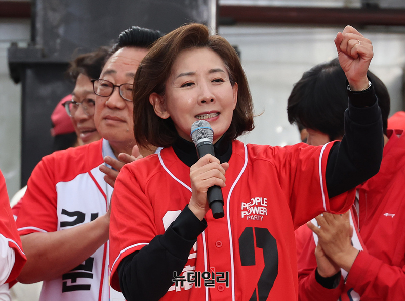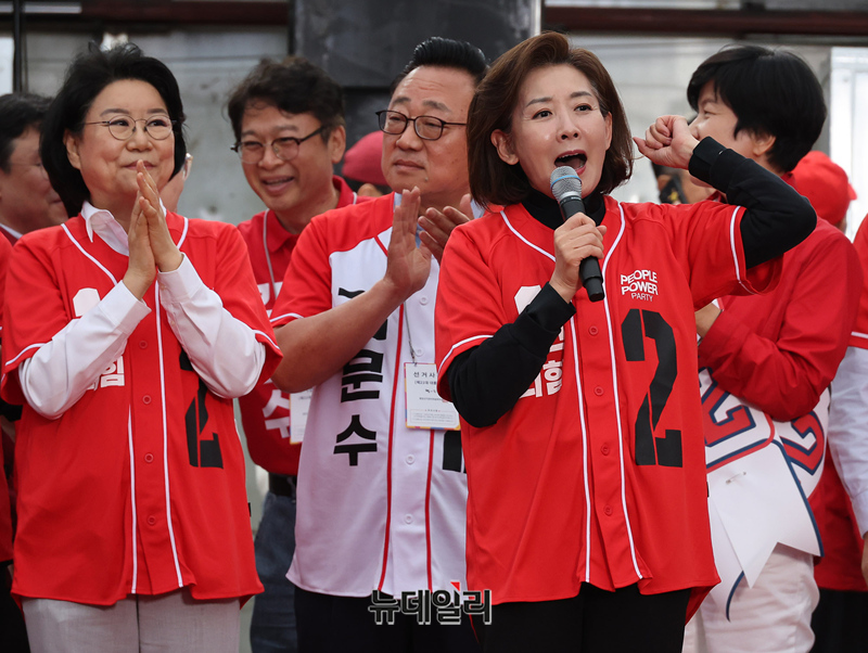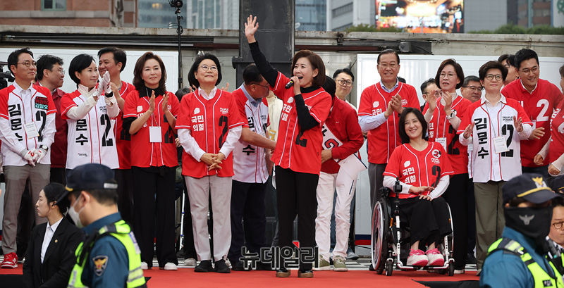 나경원 국민의힘 의원이 19일 오후 서울역 광장에서 열린 김문수 대선 후보 유세에서 지지자들에게 인사를 하고 있다.
