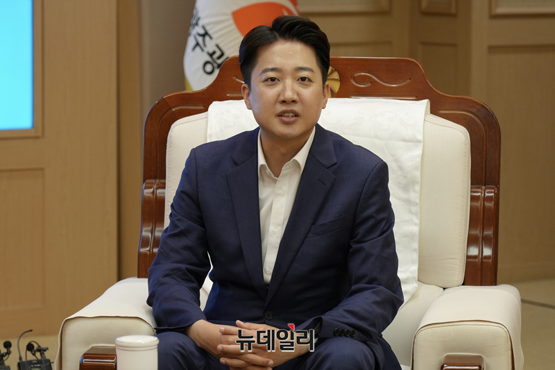 광주지역을 방문중인 이준석 개혁신당 대선후보가 20일 광주시청에서 강기정 광주시장과 대화를 나누고 있다. (사진=이준석 캠프)