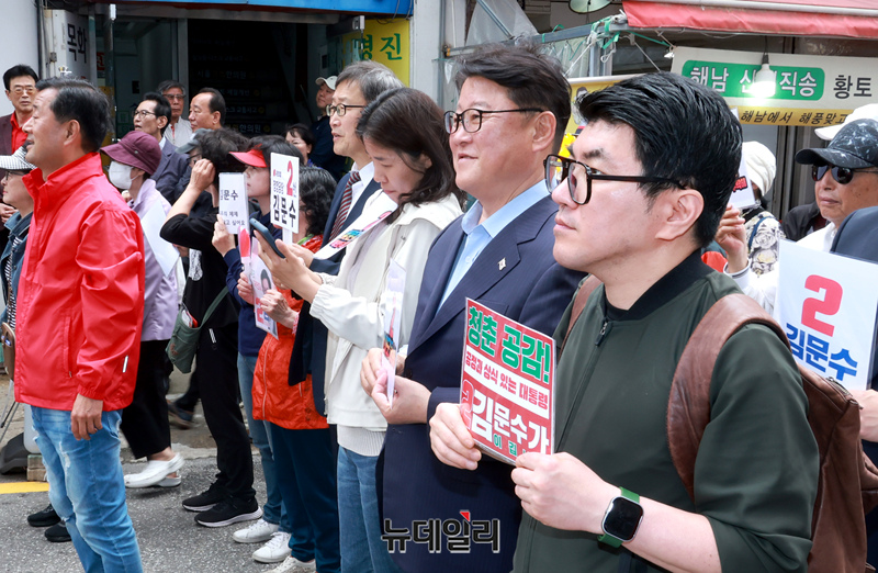 조원진 우리공화당 대표가 20일 서울 강서구 남부골목시장 입구에서 진행된 김문수 국민의힘 대선 후보 유세에 참석해 김 후보를 응원하고 있다.