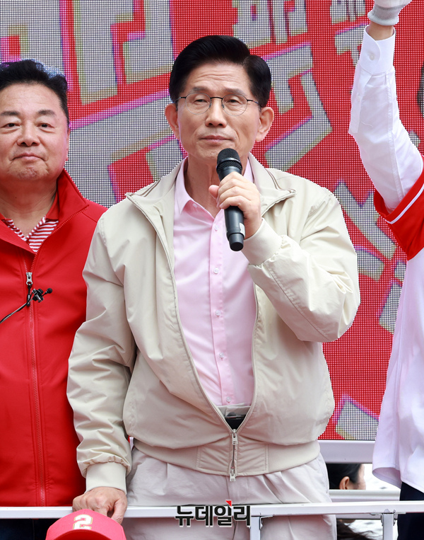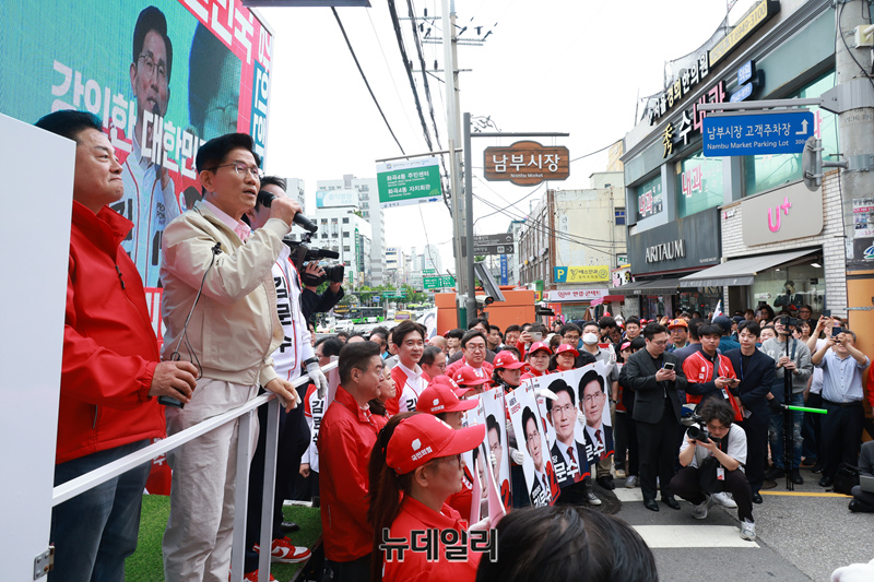 김문수 국민의힘 대선 후보가 20일 서울 강서구 남부골목시장 입구에 마련된 유세차량에 올라 지지를 호소하고 있다.