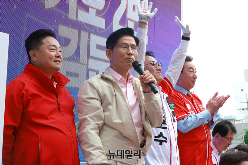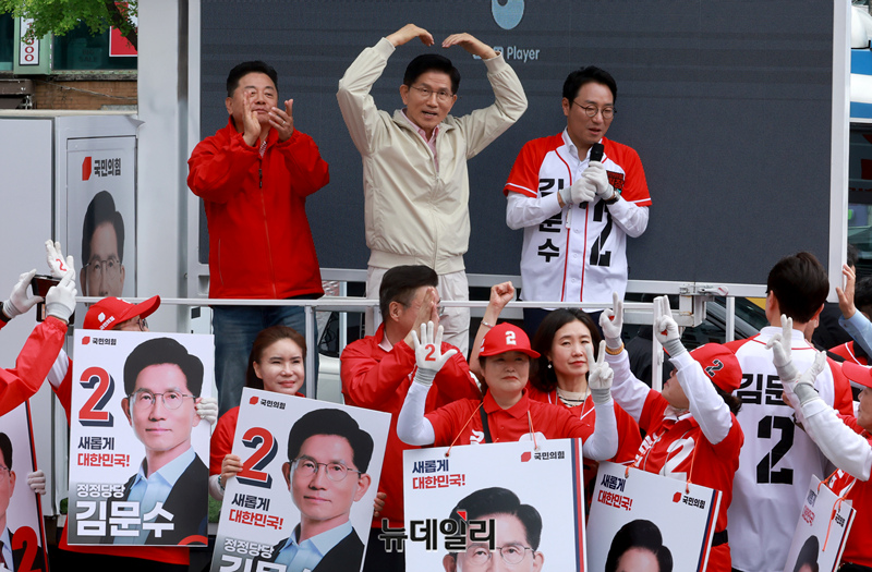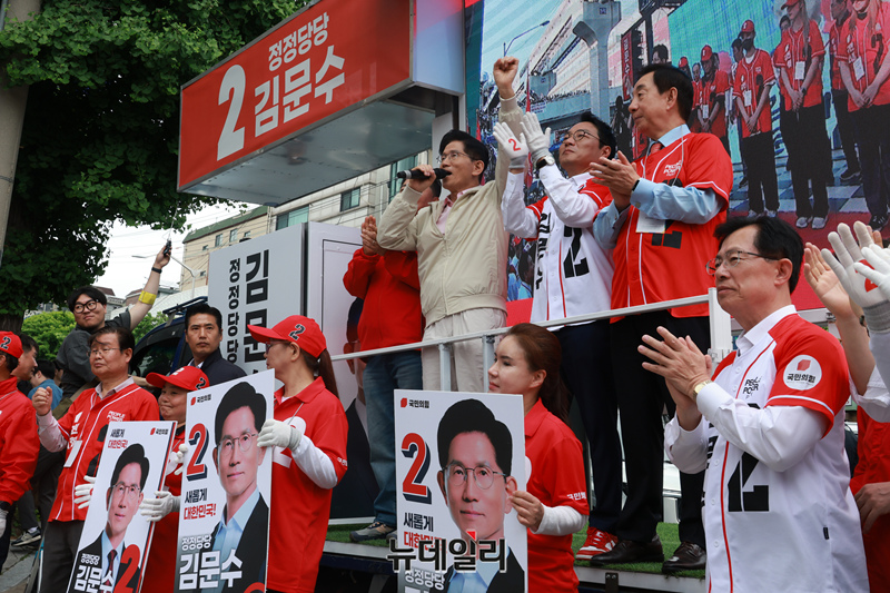 김문수 국민의힘 대선 후보가 20일 서울 강서구 남부골목시장 입구에 마련된 유세차량에 올라 지지를 호소하고 있다.