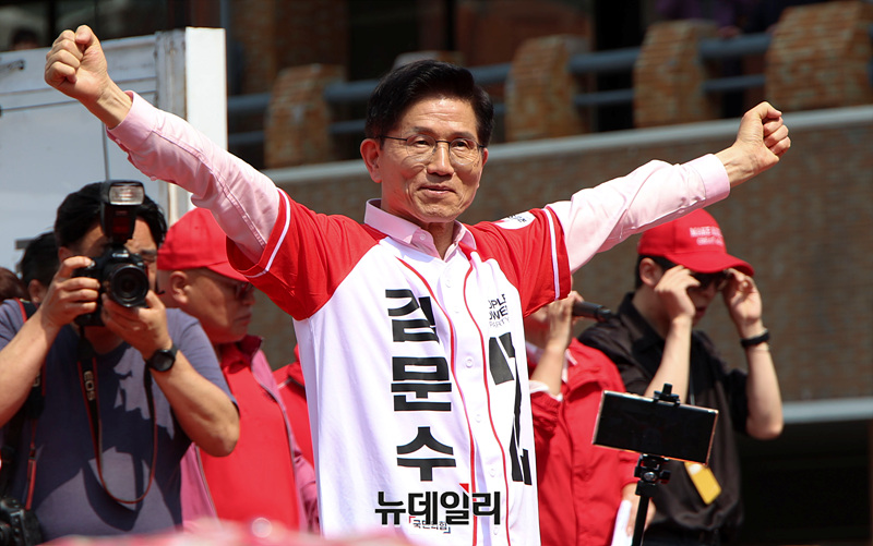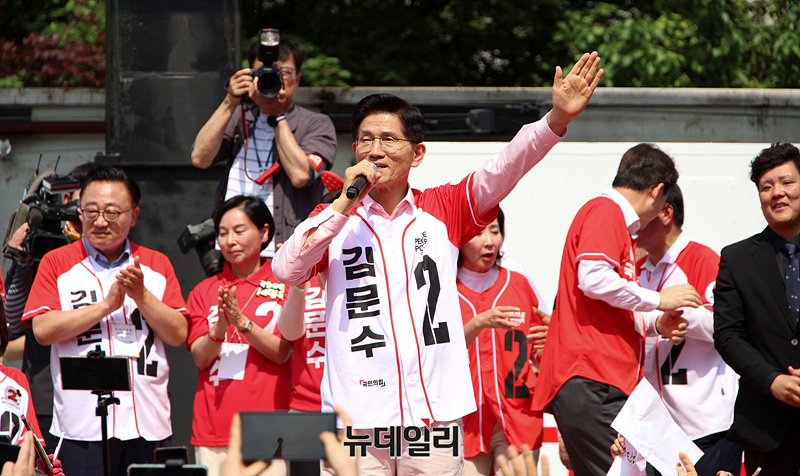김문수 국민의힘 대선 후보가 20일 오후 서울 서초구 고속버스터미널 앞 광장에서 열린 유세 현장에서 시민들을 향해 인사하고 있다.