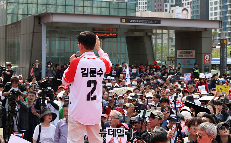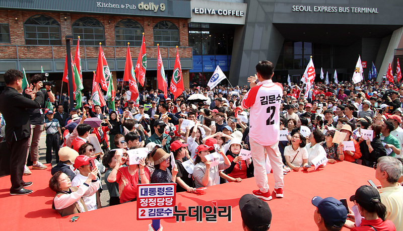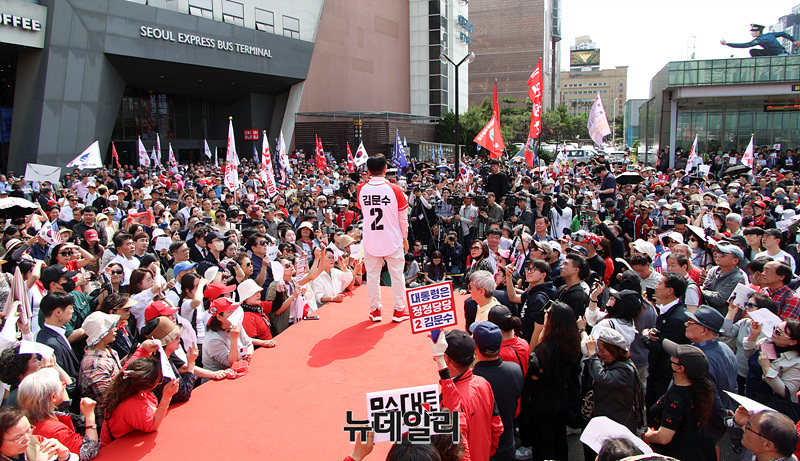 제21대 대통령 선거를 2주 앞둔 20일 오후 서울 서초구 고속버스터미널 앞 광장에서 열린 김문수 국민의힘 대선 후보 유세현장이 시민들로 가득 차 있다.