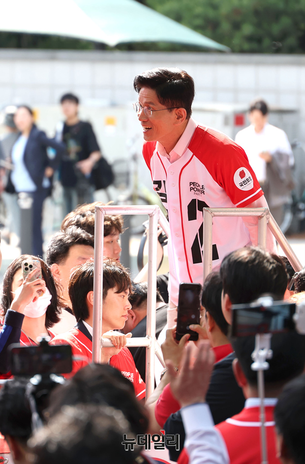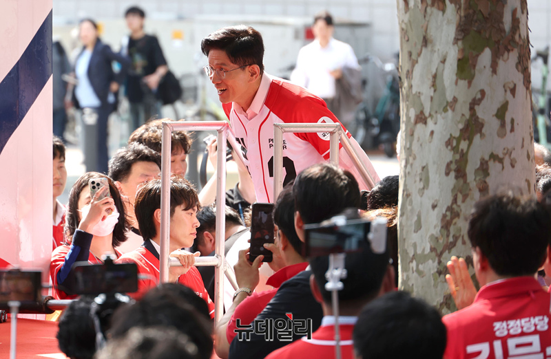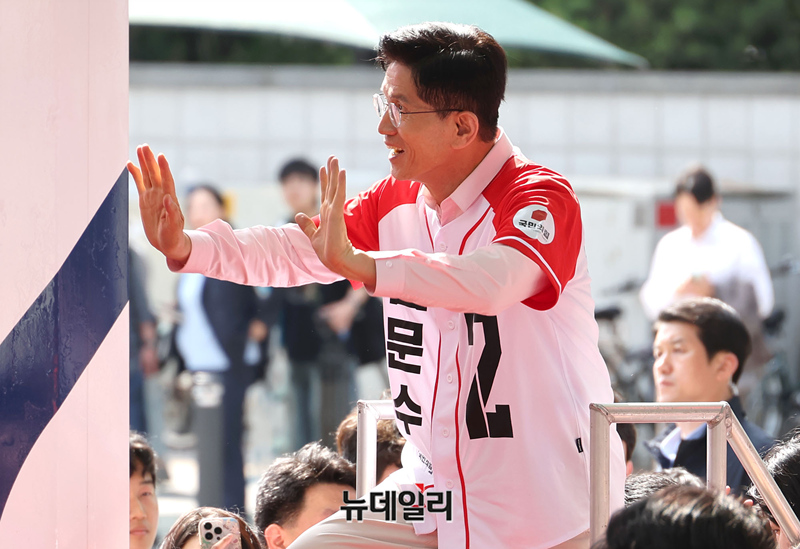 서울에서 유세를 이어가는 김문수 국민의힘 대선후보가 20일 오후 서울 송파구 석촌호 서호 인근에서 유세를 하기 위해 차량에 오르고 있다.