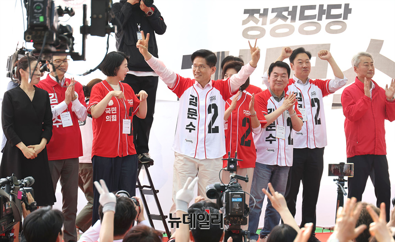 안철수 공동선대위원장이 20일 오후 서울 송파구 석촌호 서호 인근에서 열린 김문수 국민의힘 대선후보 유세에서 차량에 올라 찬조 연설을 하고 있다.