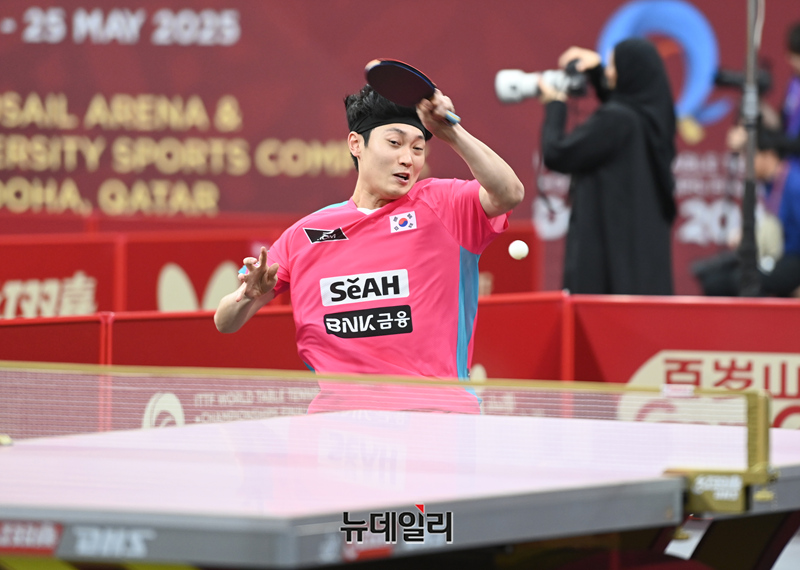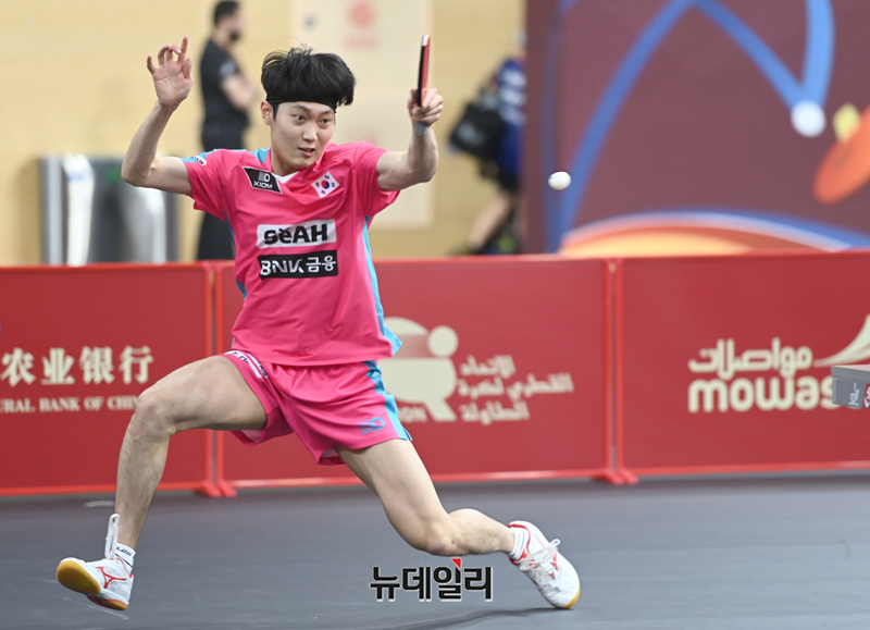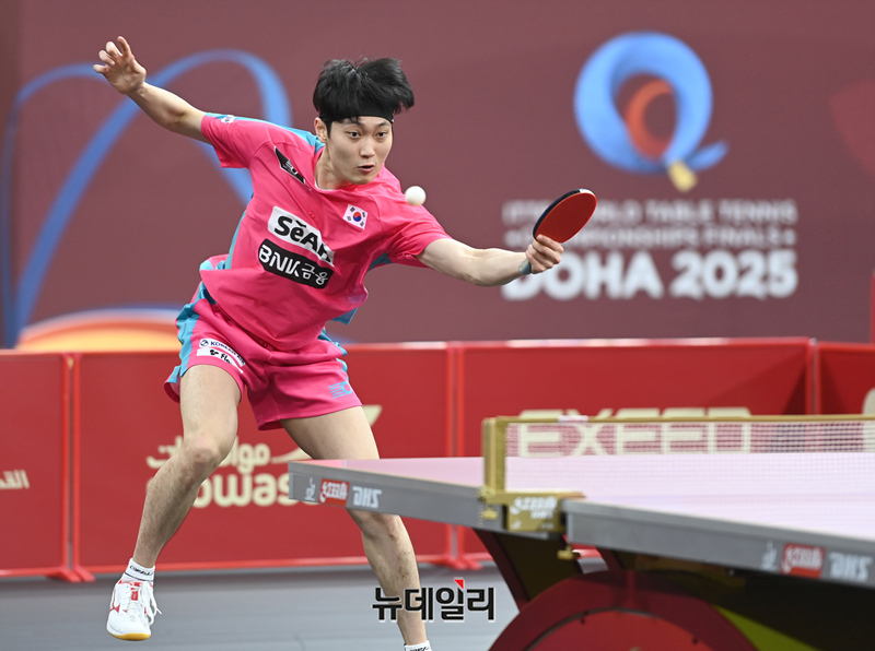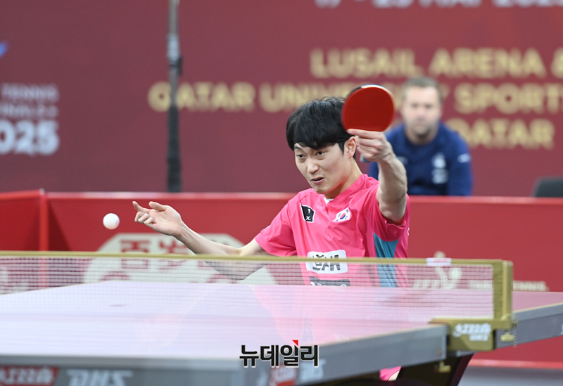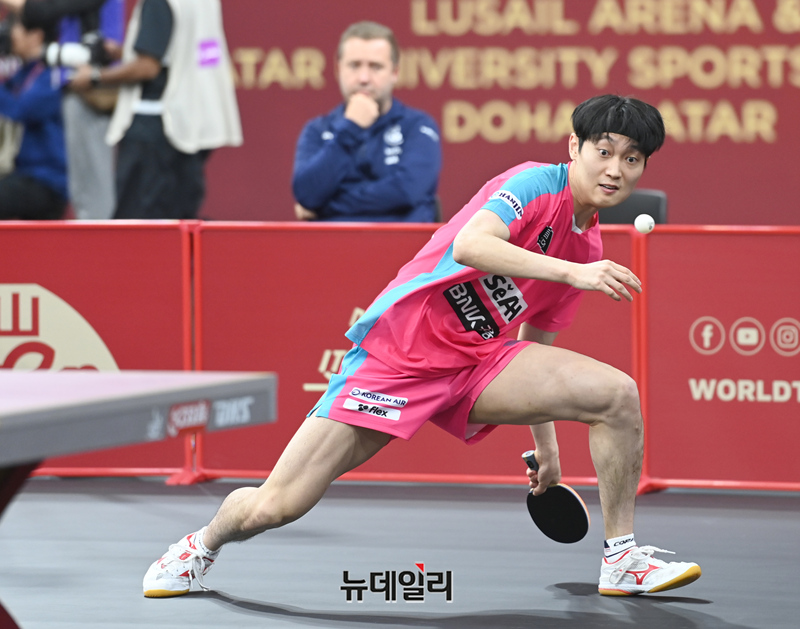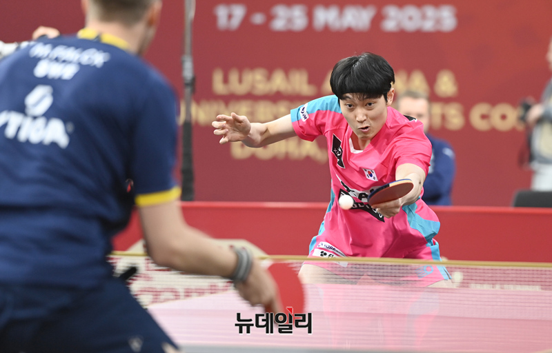 조대성 선수가 20일 카타르 도하 카타르대학교 스포츠 컴플렉스에서 열린 2025 국제탁구연맹(ITTF) 세계선수권대회 남자단식 64강 스웨덴 마티아스 팔크와 경기를 펼치고 있다. (사진=공동취재단)