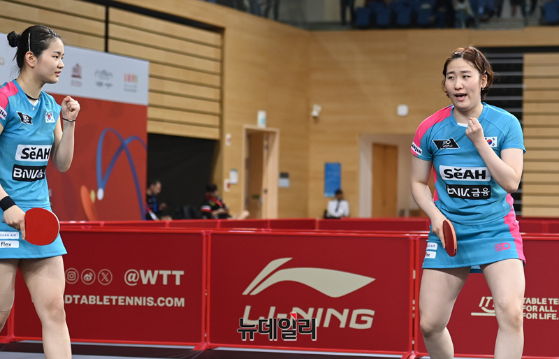김나영, 이은혜 선수가 19일 카타르 도하 카타르대학교 스포츠 컴플렉스에서 열린 2025 국제탁구연맹(ITTF) 세계선수권대회 여자복식 32강 나탈리아 바요르 (폴란드) - 타티아나 쿠쿨코바 (슬로바키아) 조와 경기를 펼치고 있다. (사진=공동취재단)