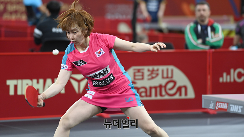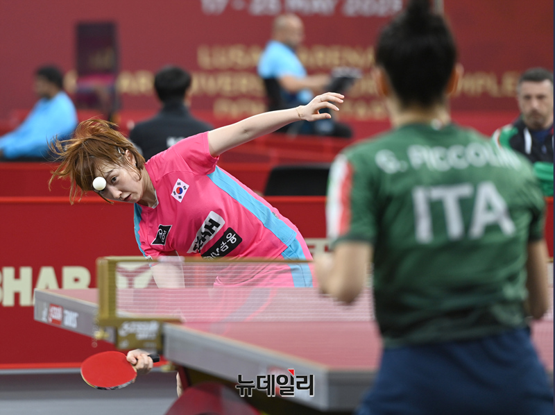 서효원 선수가 19일 카타르 도하 카타르대학교 스포츠 컴플렉스에서 열린 2025 국제탁구연맹(ITTF) 세계선수권대회 여자단식 64강 이탈리아 조르자 피콜린과 경기를 펼치고 있다. (사진=공동취재단)