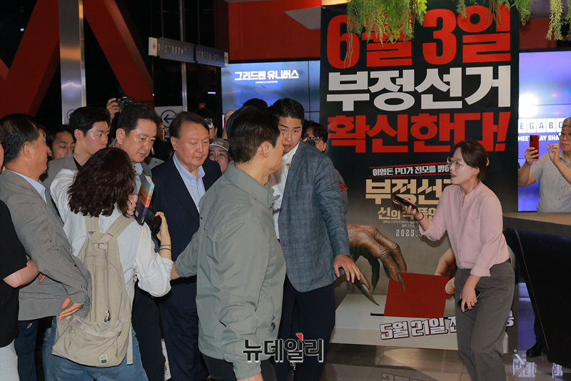 윤석열 전 대통령이 21일 오전 서울 중구 메가박스 동대문에서 개봉한 다큐멘터리 영화 '부정선거, 신의작품인가(감독 이영돈, 제작 전한길)'를 관람하고 영화관을 나서고 있다.