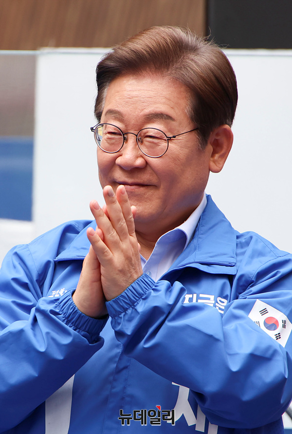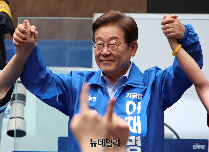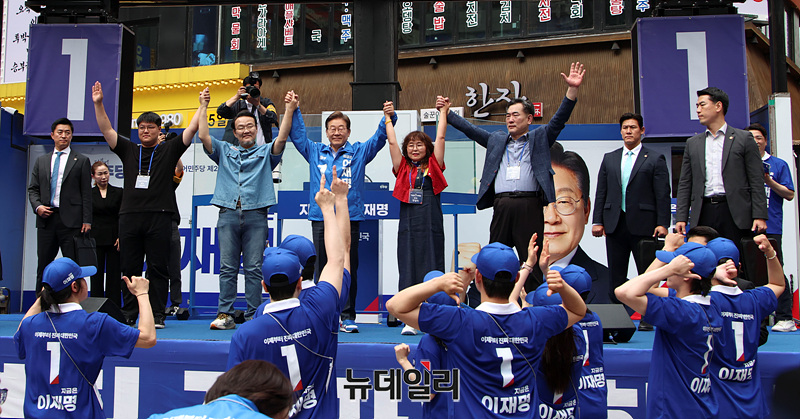 인천 지역에서 유세를 이어가는 이재명 더불어민주당 대선 후보가 21일 오후 인천 남동구 구월 로데오광장에서 열린 유세현장에서 지지자들을 향해 인사하고 있다.(인천=서성진 기자)