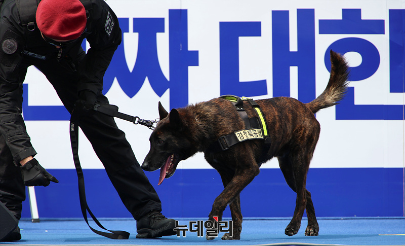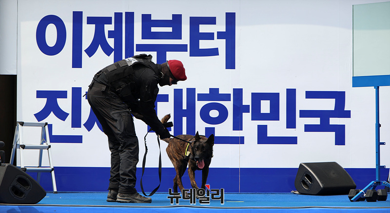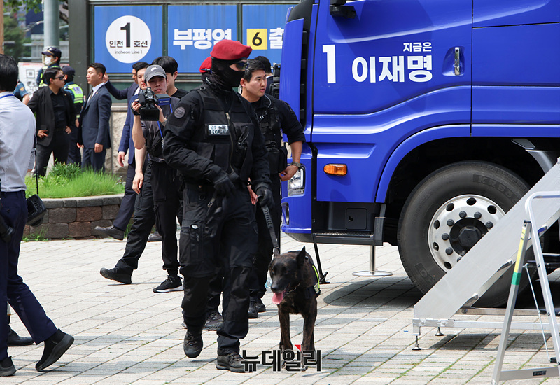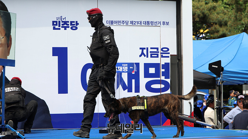 제21대 대통령 선거를 앞둔 21일 오후 인천 부평구 부평역 북광장에서 열린 이재명 더불어민주당 대선 후보 유세현장에서 경찰특공대가 폭발물 수색을 하고 있다. (인천=서성진 기자)