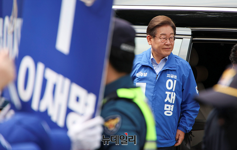 인천 지역에서 유세를 이어가는 이재명 더불어민주당 대선 후보가 21일 오전 인천 부평구 부평역 북광장에서 열린 유세현장에 도착하며 인사를 나누고 있다. (인천=서성진 기자)