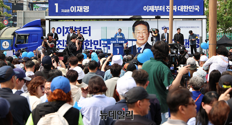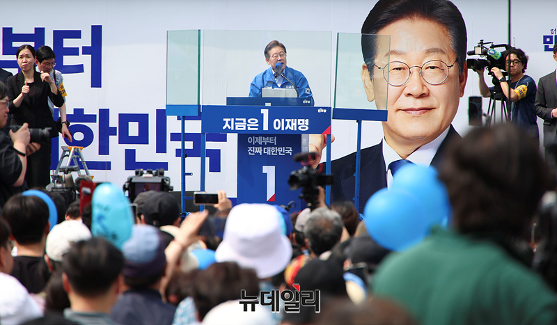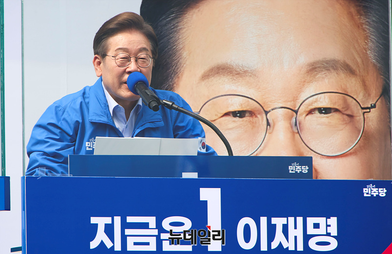 인천 지역에서 유세를 이어가는 이재명 더불어민주당 대선 후보가 21일 오전 인천 부평구 부평역 북광장에서 열린 유세현장에서 지지를 호소하고 있다. (인천=서성진 기자)