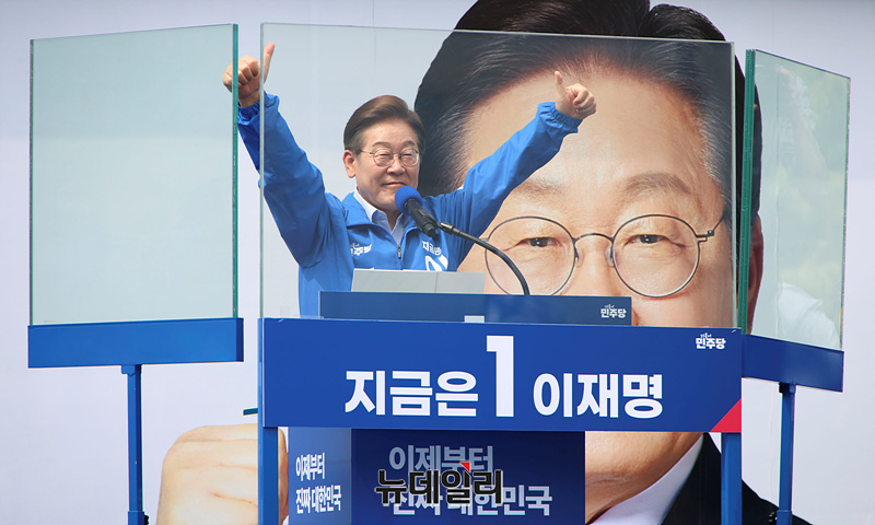 [포토] 방탄유리 뒤에서 지지호소하는 이재명 후보