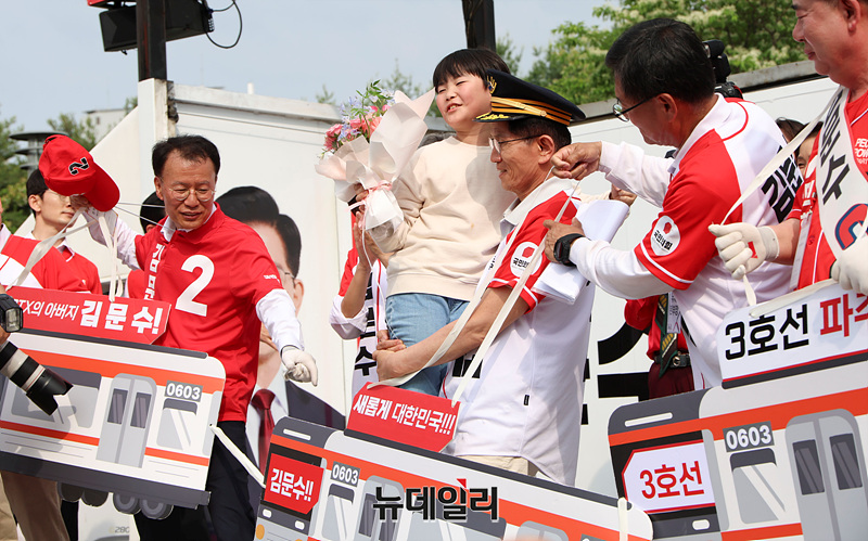 김문수 국민의힘 대선 후보가 21일 오후 경기 파주시 새암공원에서 열린 유세현장에서 아이를 안고 연단에 오르고 있다. (경기 파주=서성진 기자)