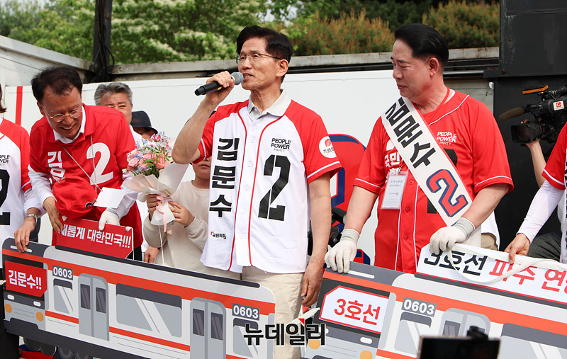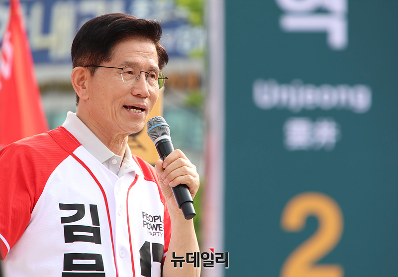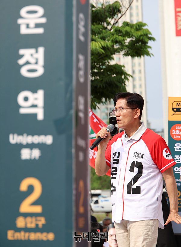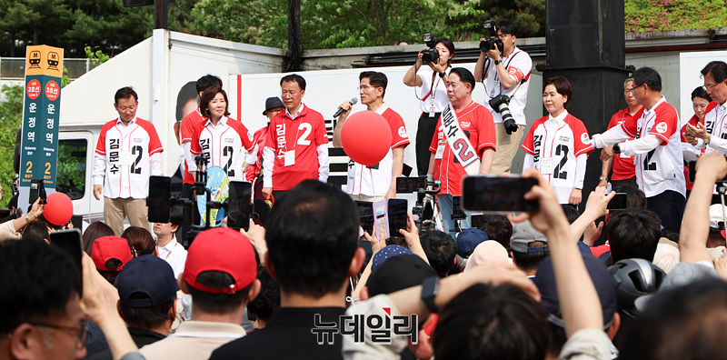 김문수 국민의힘 대선 후보가 21일 오후 경기 파주시 새암공원에서 열린 유세현장에서 지지를 호소하고 있다. (경기 파주=서성진 기자)