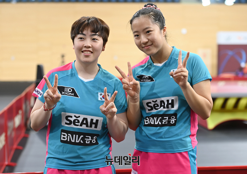 신유빈(오른쪽), 유한나가 20일(현지시간) 카타르 도하 카타르대학교 스포츠 컴플렉스에서 열린 2025 국제탁구연맹(ITTF) 세계선수권대회 여자복식 16강 독일 아네트 카우프만-샤오나 산 조와 경기 후 석은미 감독과 포즈를 취하고 있다. (사진=공동취재단)