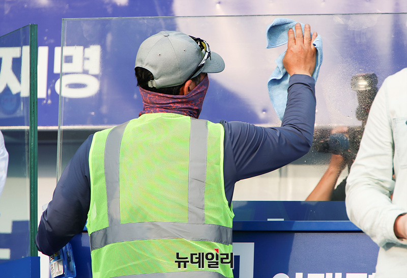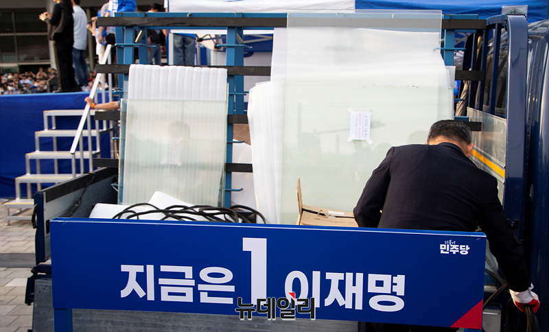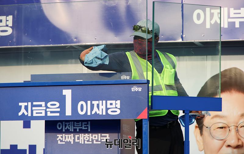 이재명 더불어민주당 대선 후보가 인천 지역에서 유세를 이어가는 21일 오전 인천 계양구 계양역 앞에서 열린 유세현장에 방탄유리가 설치되고 있다. (인천=서성진 기자)