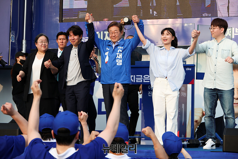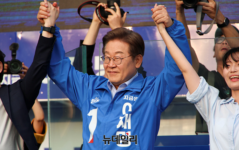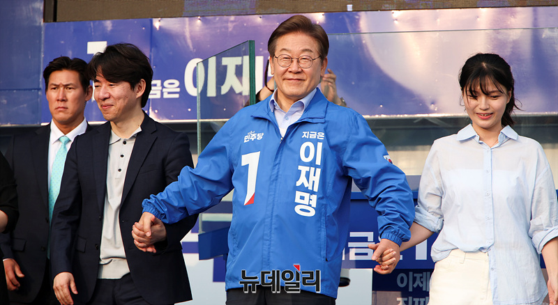 인천 지역에서 유세를 이어가는 이재명 더불어민주당 대선 후보가 21일 오전 인천 계양구 계양역 앞에서 열린 유세현장에서 지지자들을 향해 인사하고 있다. (인천=서성진 기자)