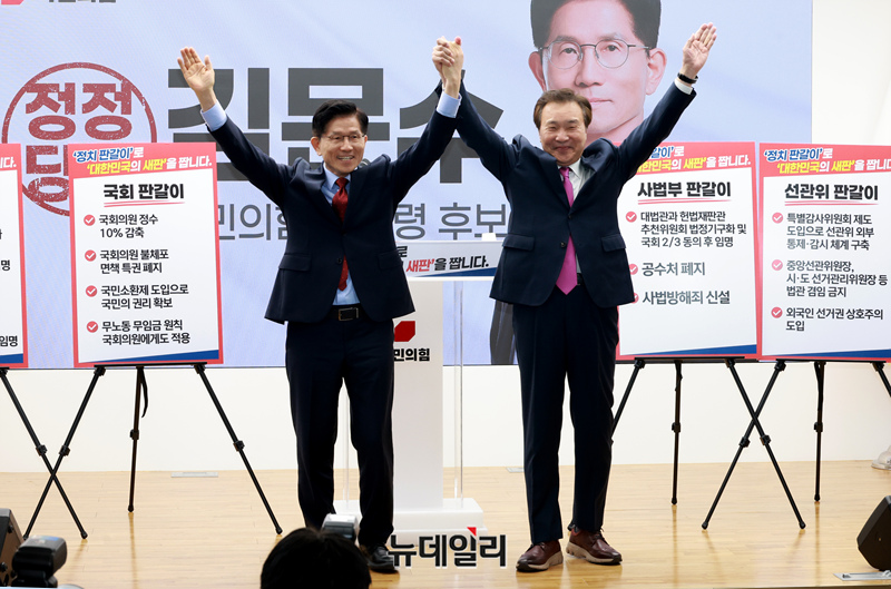 손학규 전 민주당·바른미래당 대표가 22일 오전 서울 여의도 국민의힘 중앙당사에서 열린 정치개혁 관련 긴급 기자회견에서 김문수 국민의힘 대선후보 지지 선언을 하고 있다.