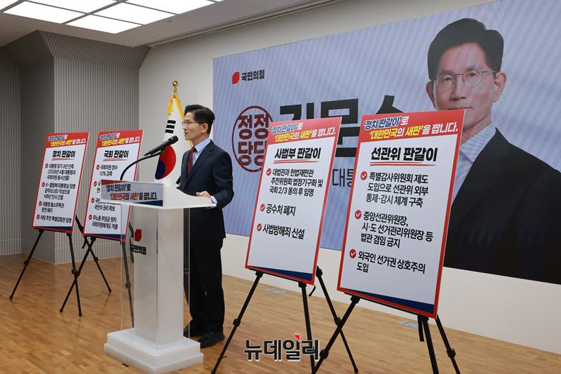 김문수 국민의힘 대선 후보가 22일 서울 여의도 국민의힘 중앙당사에서 열린 정치개혁 관련 긴급 기자회견에서 발언을 하고 있다.