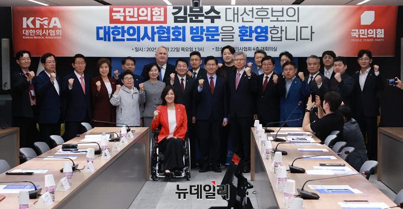 김문수 국민의힘 대선후보가 22일 오후 서울 용산구 대한의사협회에 열린 의협 회장단과 간담회에 참석해 김택우 대한의사협회장 등 참석자들과 기념촬영을 하고 있다.