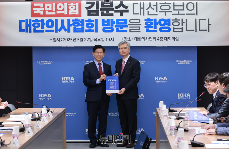 김문수 국민의힘 대선후보가 22일 오후 서울 용산구 대한의사협회에 열린 의협 회장단과 간담회에 참석해 김택우 대한의사협회장에게 정책제안서를 전달 받고 있다.
