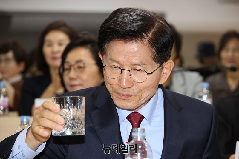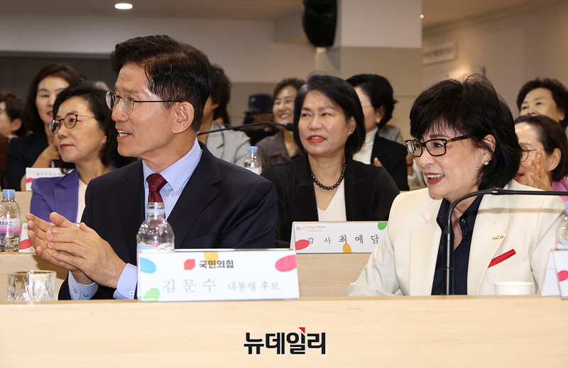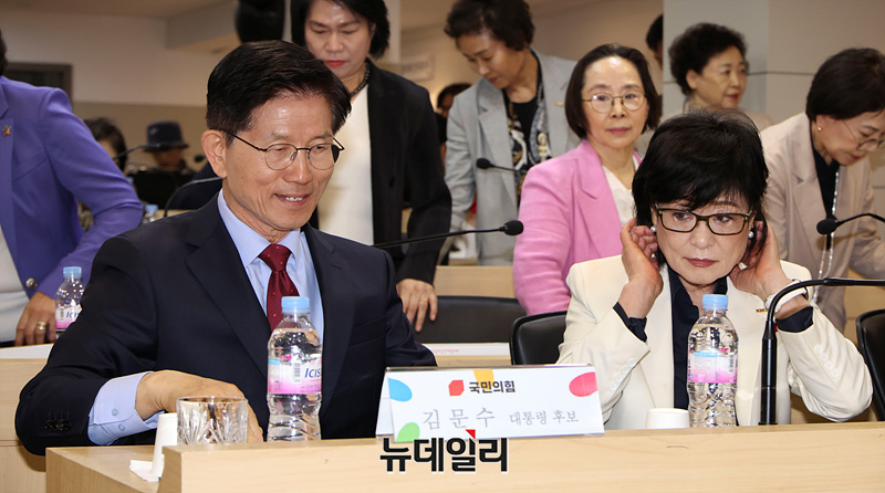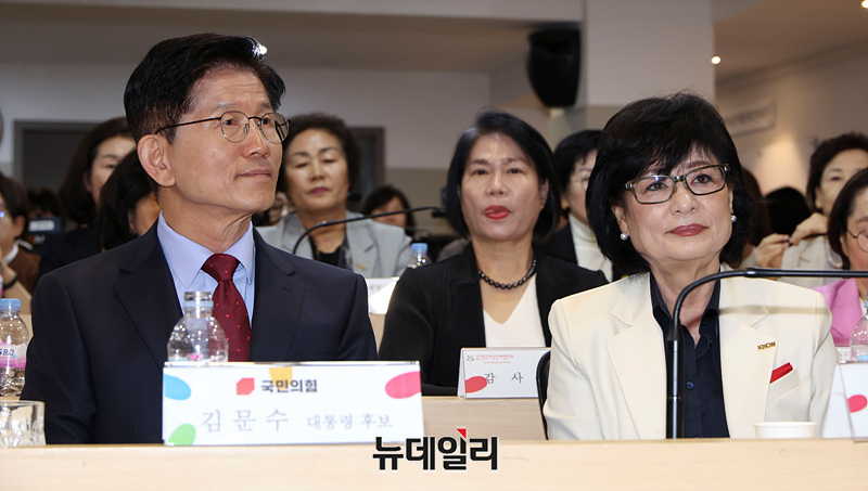 김문수 국민의힘 대선 후보가 22일 오후 서울 용산구 한국여성단체협의회에서 열린 정책협약식에 참석해 자리하고 있다.