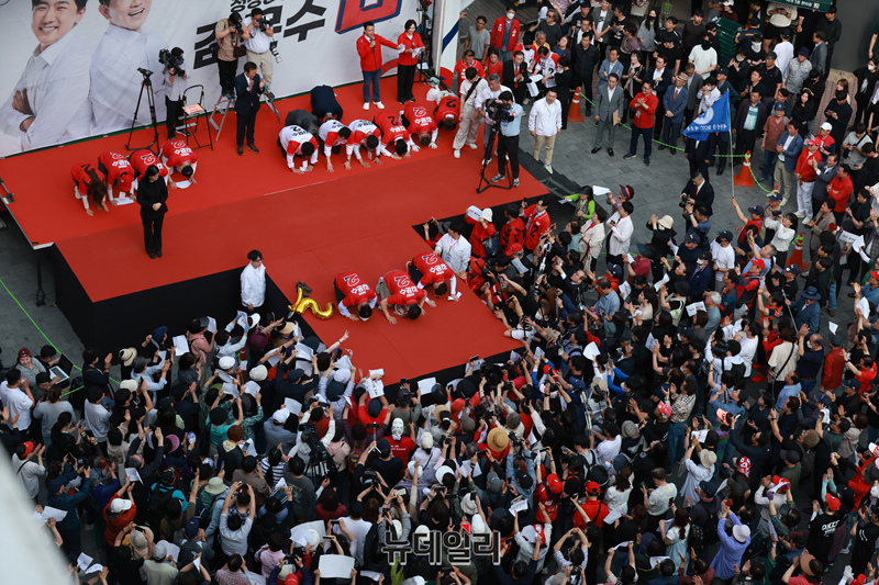 김문수 국민의힘 대통령 후보가 22일 오후 경기 광명시 철산로데오거리에서 열린 유세에 참석해 지지를 호소하며 큰절을 하고 있다. (경기 광명=이종현 기자)