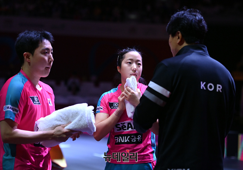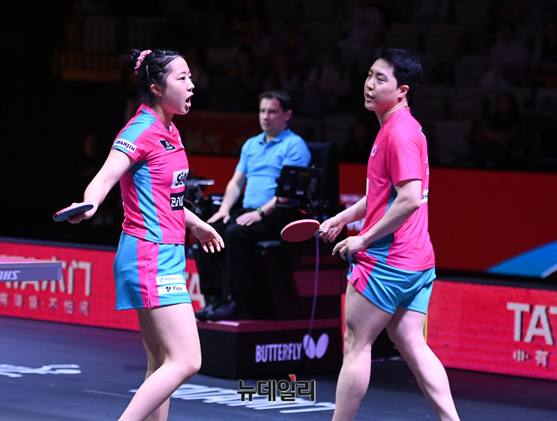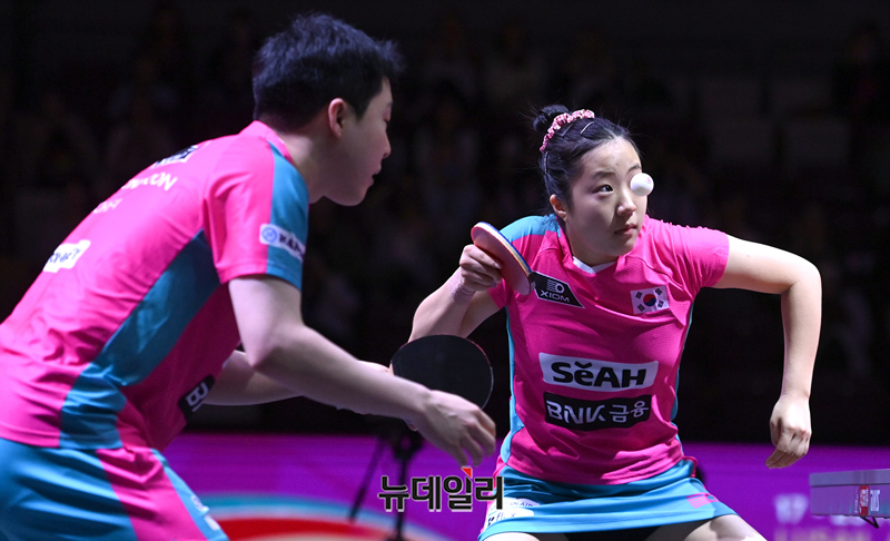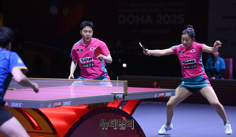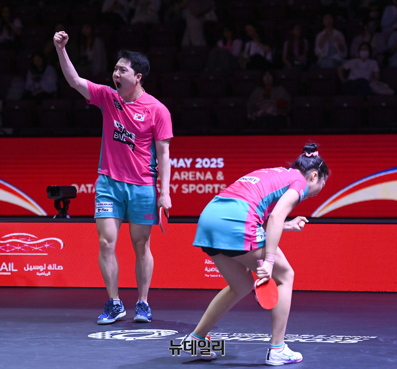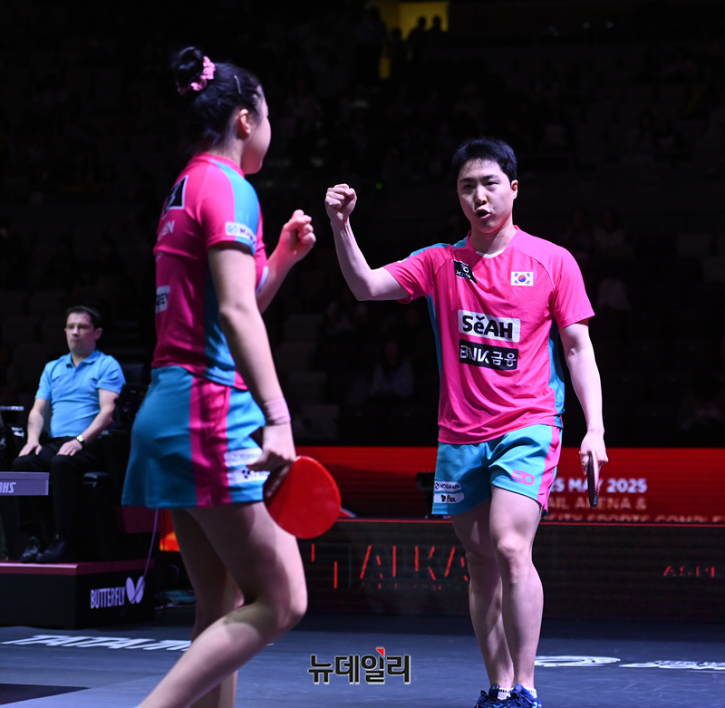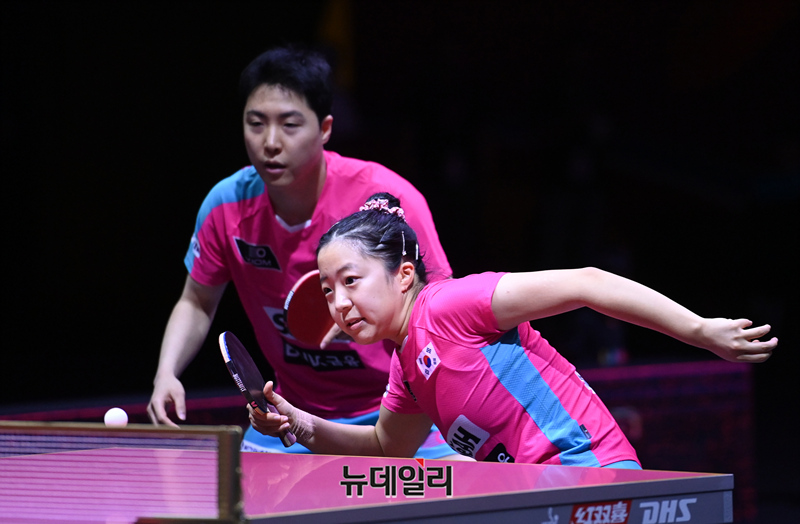 임종훈, 신유빈 선수가 22일 카타르 도하 루사일 아레나에서 열린 2025 국제탁구연맹(ITTF) 세계선수권대회 혼합복식 8강 대만 린윈주 - 정이칭과 경기를 펼치고 있다. (사진=공동취재단)