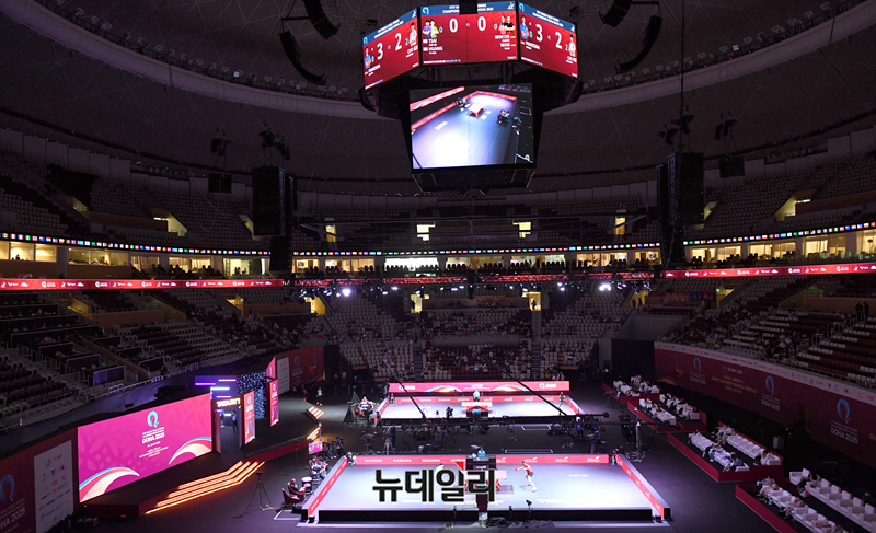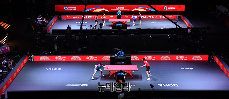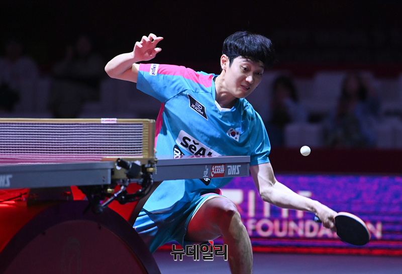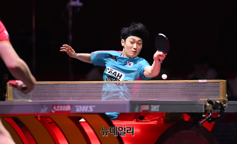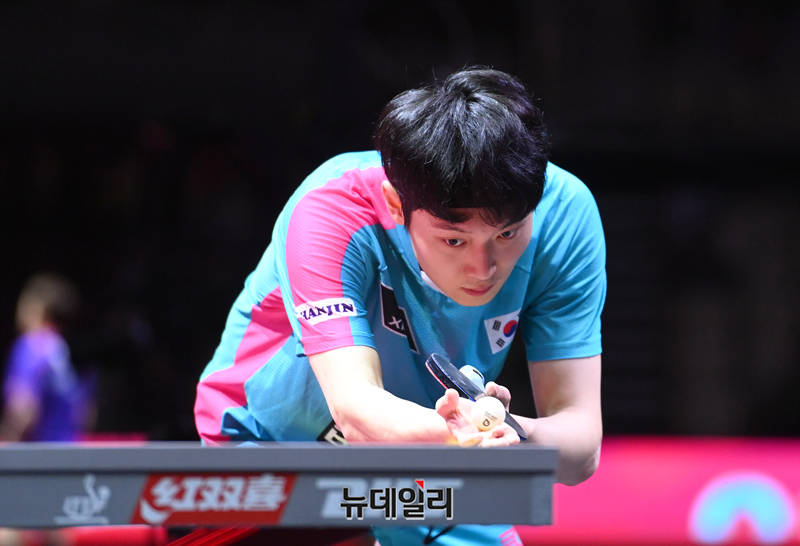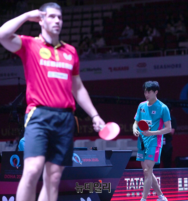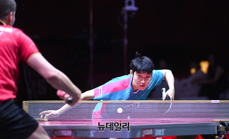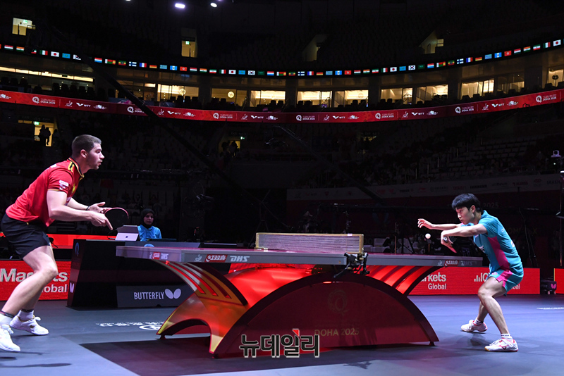 조대성 선수가 21일 카타르 도하 루사일 아레나에서 열린 2025 국제탁구연맹(ITTF) 세계선수권대회 남자단식 32강 독일 파트리크 프란치스카와 경기를 펼치고 있다. (사진=공동취재단)