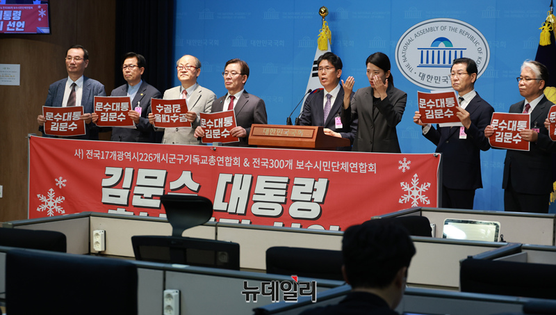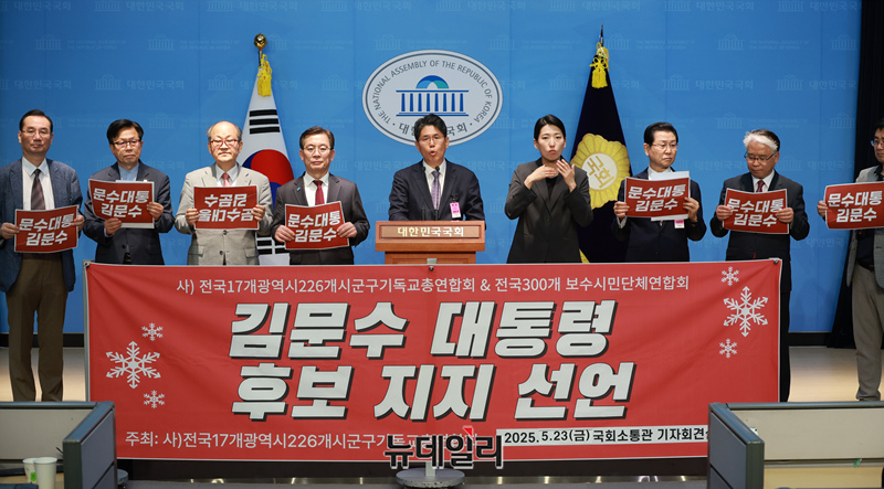 (사)전국 17개 광역시도 226개 시군구 기독교총연합회 회원들이 23일 오후 국회 소통관에서 기자회견을 갖고 김문수 국민의힘 대선후보 지지선언을 하고 있다.