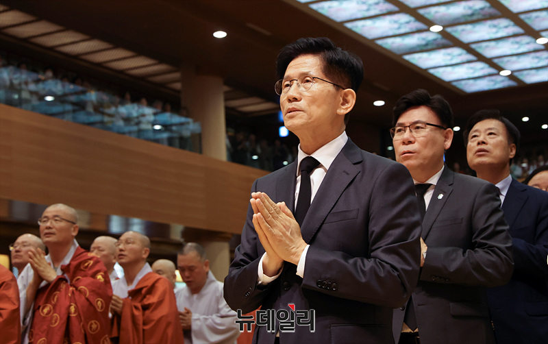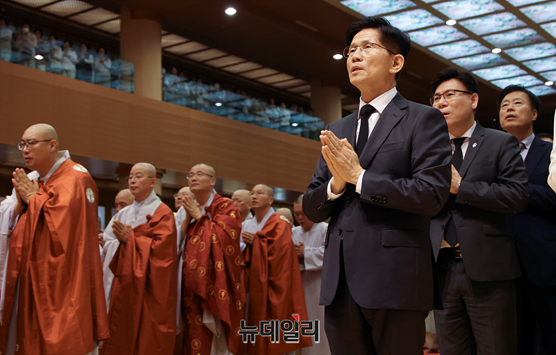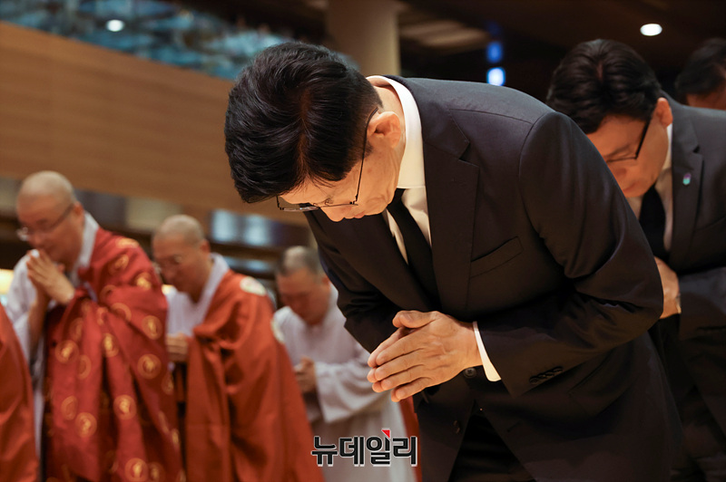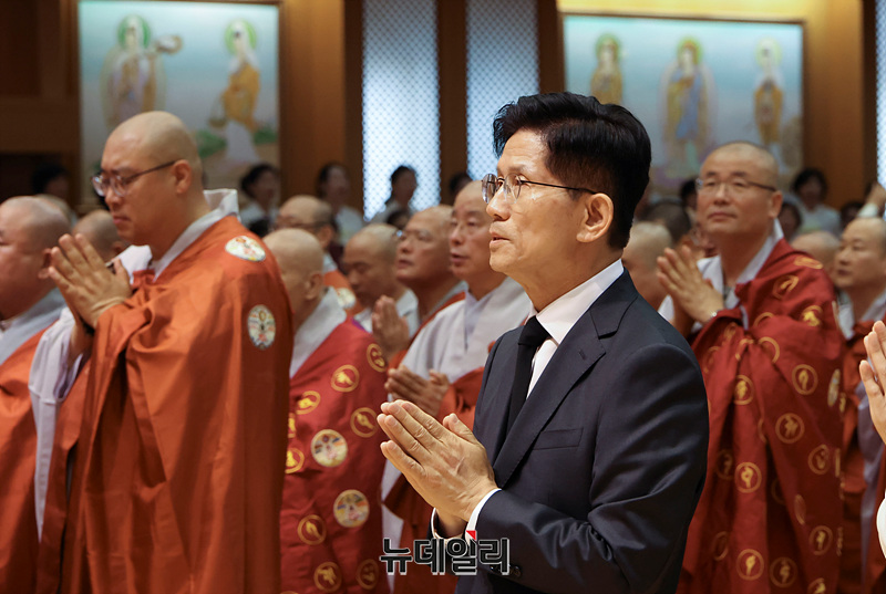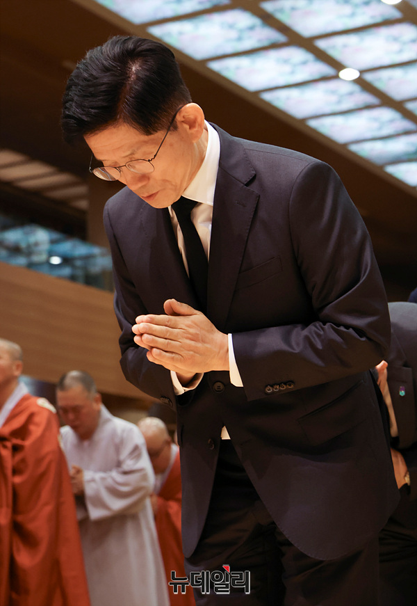 김문수 국민의힘 대선 후보가 24일 오전 충북 단양군 구인사에서 열린 상월원각대조사 제51주기 열반대재에서 합장하고 있다.