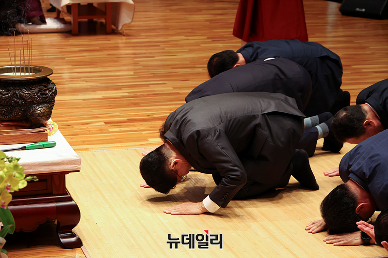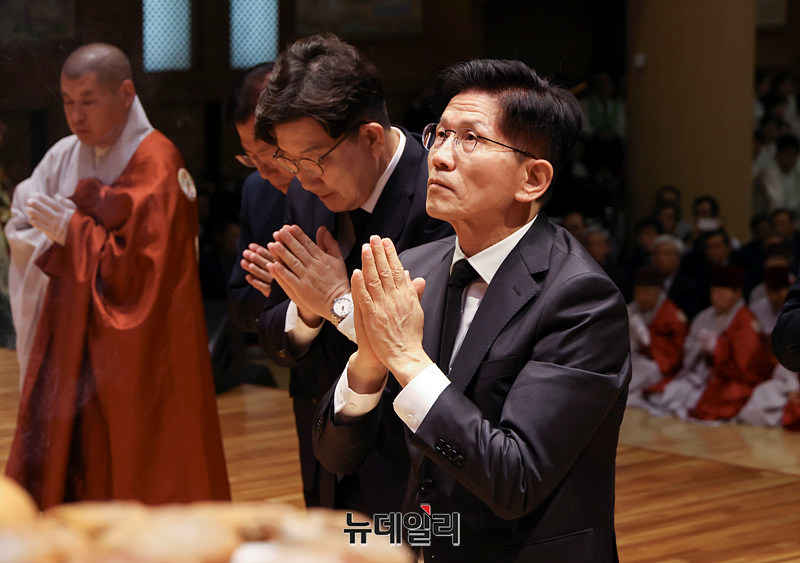 김문수 국민의힘 대선 후보가 24일 오전 충북 단양군 구인사에서 열린 상월원각대조사 제51주기 열반대재에서 헌향하고 있다.