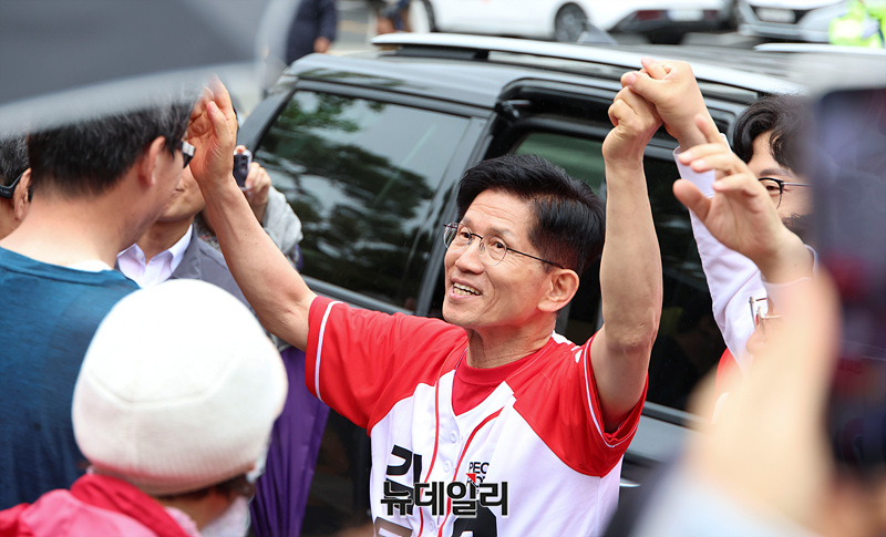 김문수 국민의힘 대선 후보가 24일 오후 경북 안동시 웅부공원에서 열린 유세현장에 참석하며 시민들과 인사를 나누고 있다.