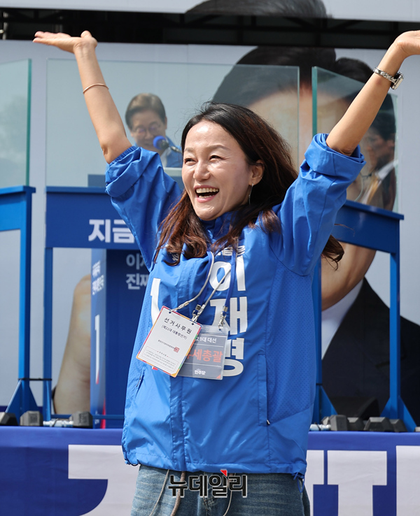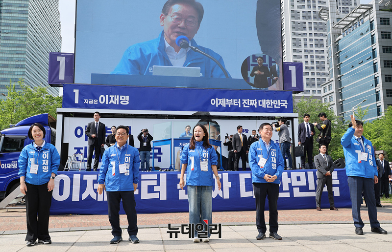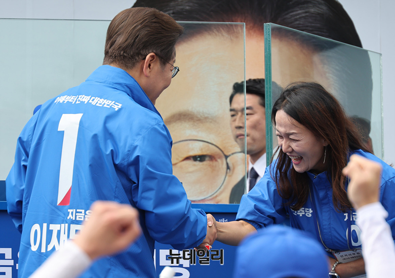6.3 대통령 선거를 열흘 앞둔 24일 오후 이재명 더불어민주당 대선 후보가 경기 안양시 평촌중앙공원에서 열린 유세에서 이재정 의원을 소개하고 있다.