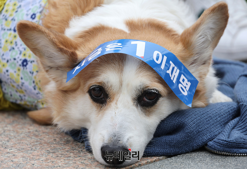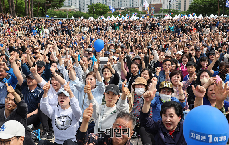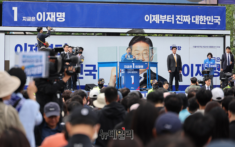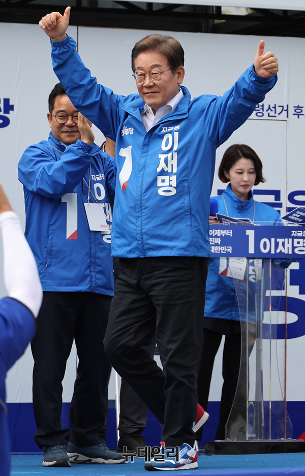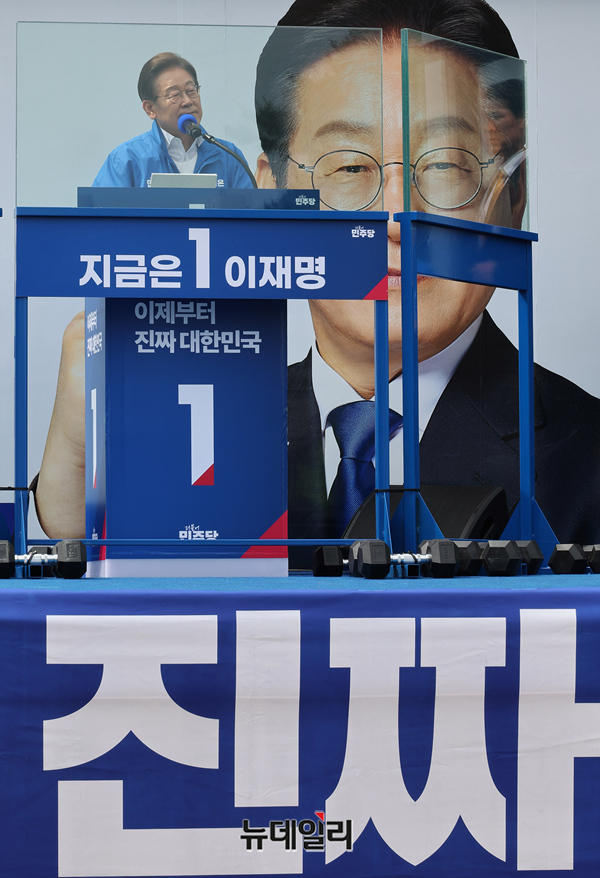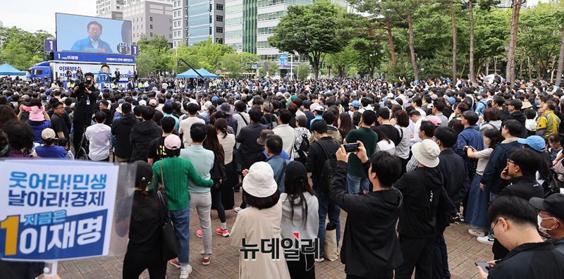6.3 대통령 선거를 열흘 앞둔 24일 오후 이재명 더불어민주당 대선 후보가 경기 안양시 평촌중앙공원에서 열린 유세에서 지지호소를 하고 있다.