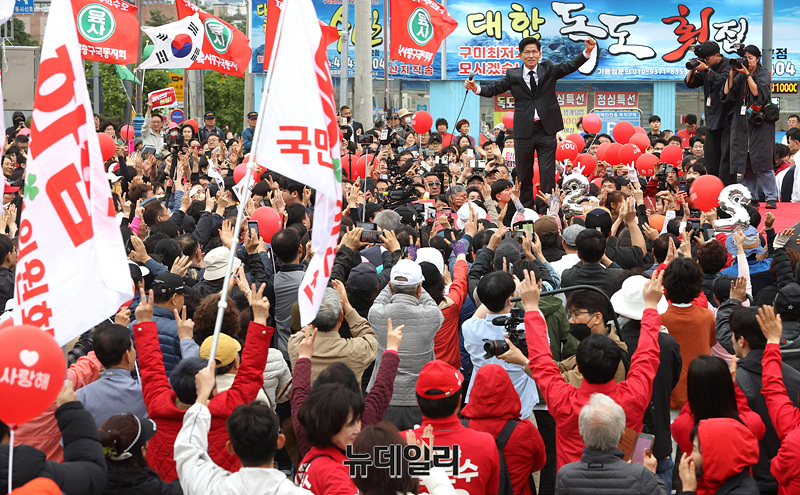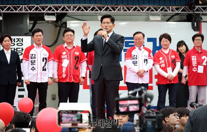 김문수 국민의힘 대선 후보가 6.3 대통령 선거를 열흘 앞둔 24일 오후 경북 구미시 박정희 대통령 생가 앞에서 열린 유세현장에서 지지를 호소하고 있다.