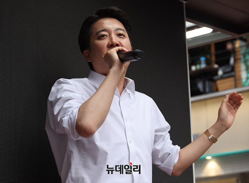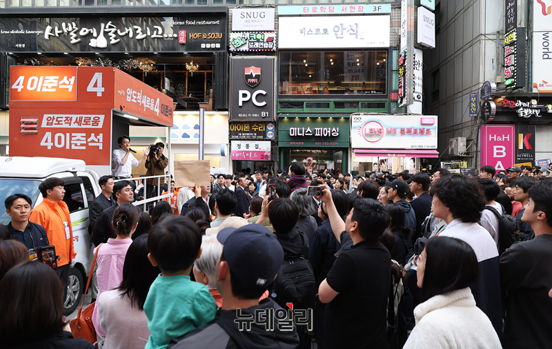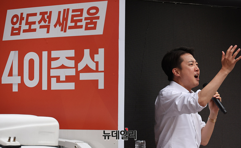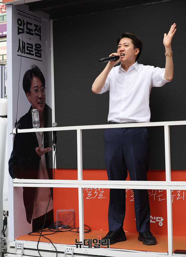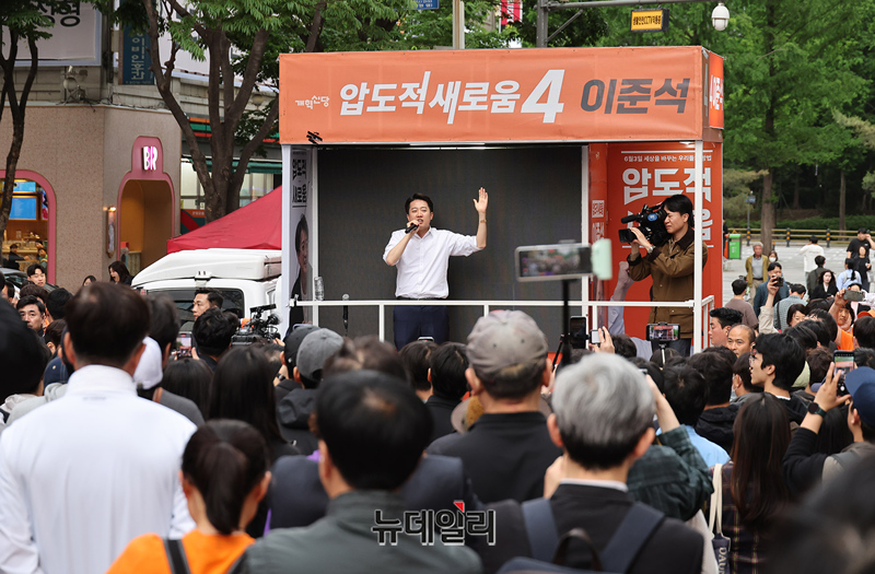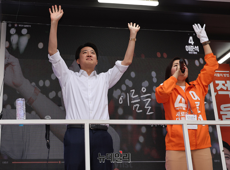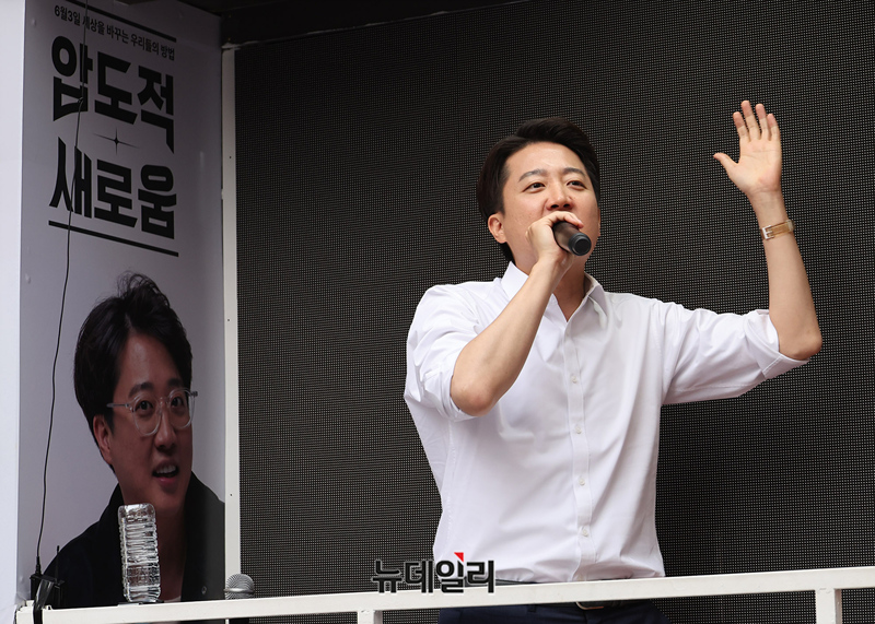 6.3 대통령 선거를 열흘 앞둔 24일 오후 이준석 개혁신당 대선 후보가 경기 성남시 서현역에서 유세차량에 올라 지지호소를 하고 있다.