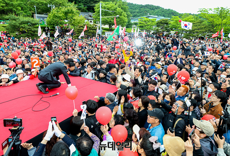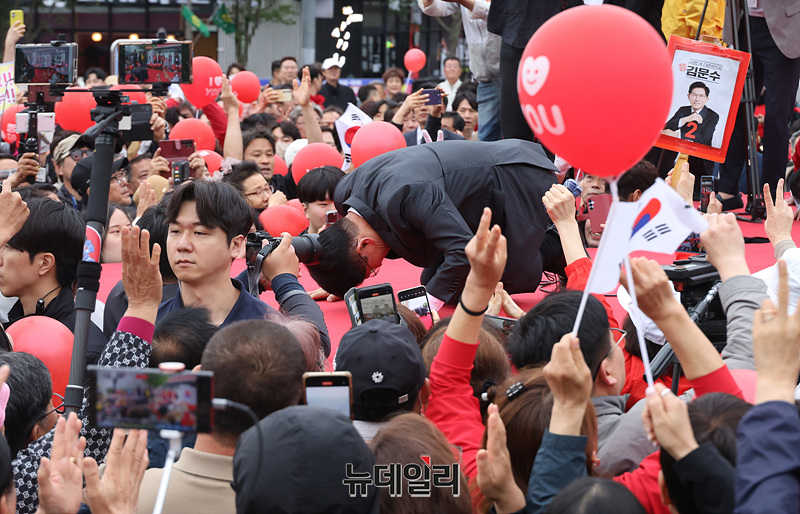 김문수 국민의힘 대선 후보가 6.3 대통령 선거를 열흘 앞둔 24일 오후 경북 구미시 박정희 대통령 생가 앞에서 열린 유세현장에서 절을 하고 있다.