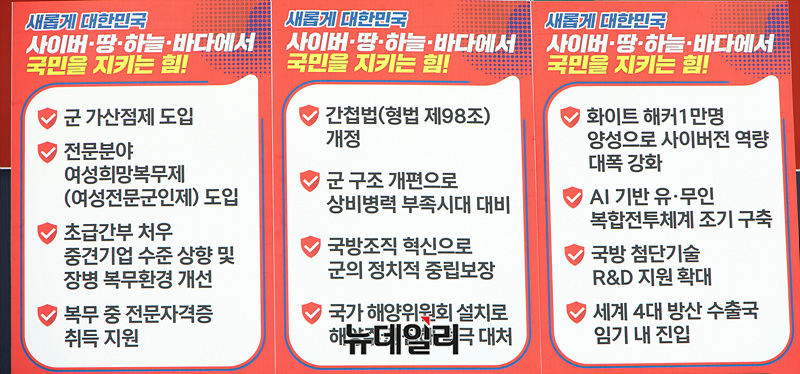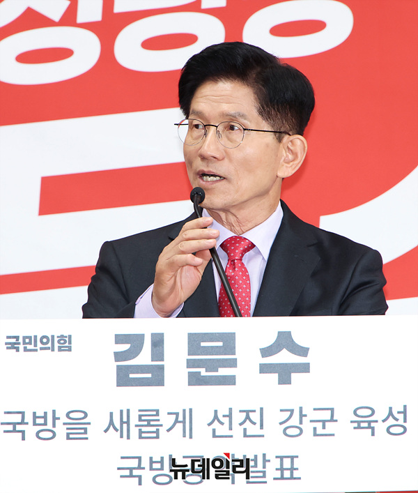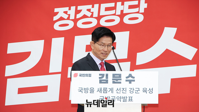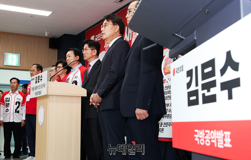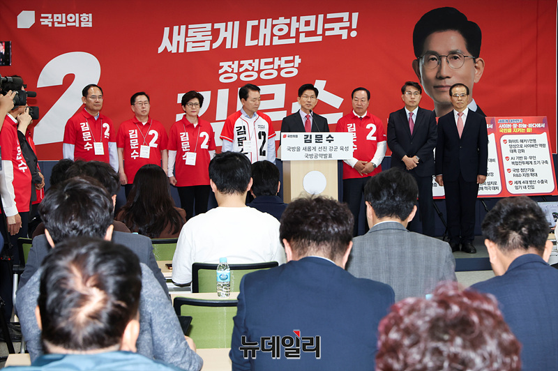 김문수 국민의힘 대선 후보가 6.3 대통령 선거를 앞둔 25일 오전 충남 계룡시 병영체험관에서 국방공약을 발표하고 있다.