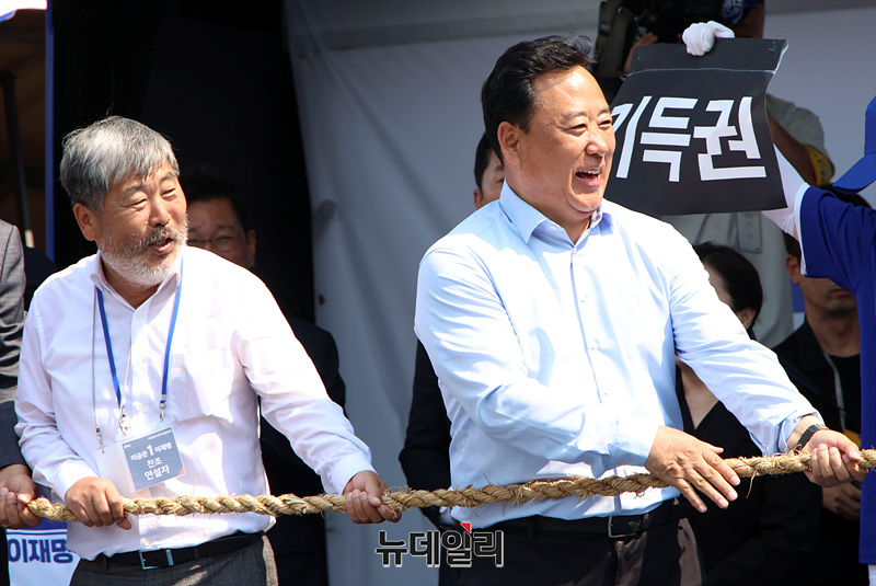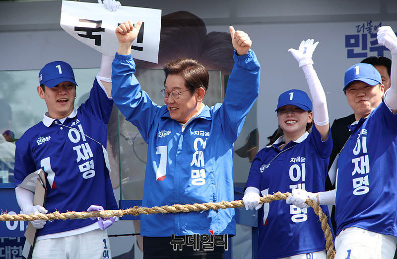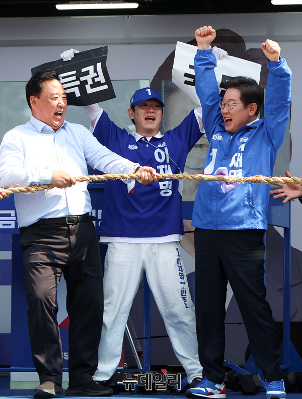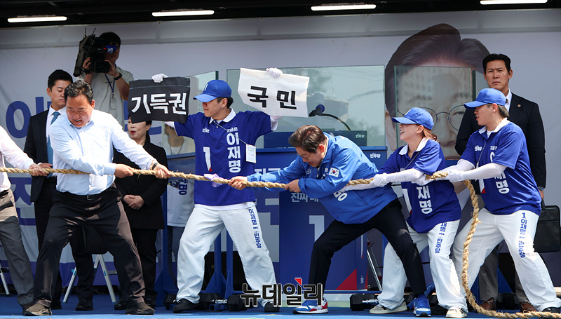 이재명 더불어민주당 대선 후보가 6.3 대통령 선거를 앞둔 25일 오후 충남 당진전통시장 입구에서 열린 유세현장에서 줄다리기 퍼포먼스를 하고 있다.