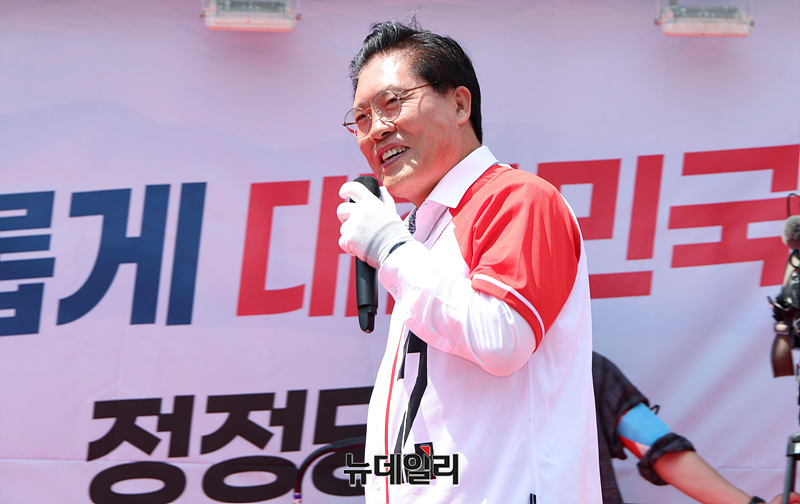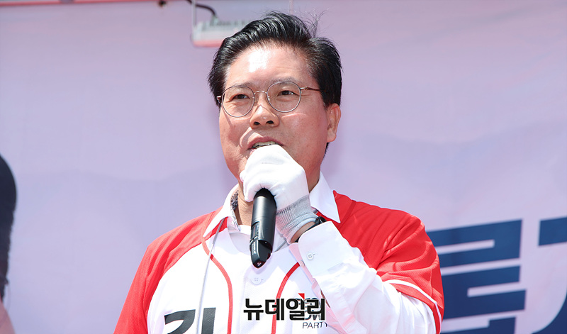 송석준 국민의힘 의원이 6.3 대통령 선거를 앞둔 26일 오전 경기 안성중앙시장 서인사거리에서 열린 김문수 대선 후보 유세현장에서 발언하고 있다.
