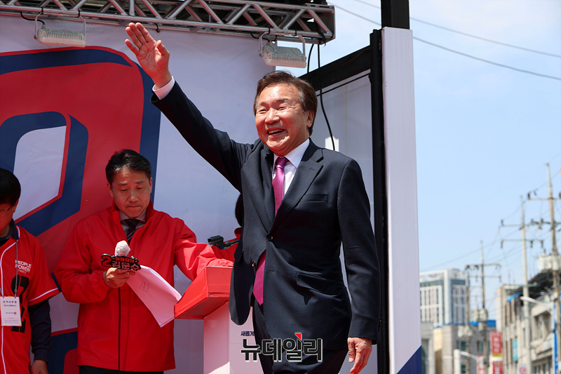 손학규 전 바른미래당 대표가 6.3 대통령 선거를 앞둔 26일 오전 경기 안성중앙시장 서인사거리에서 열린 김문수 대선 후보 유세현장에서 발언하고 있다.