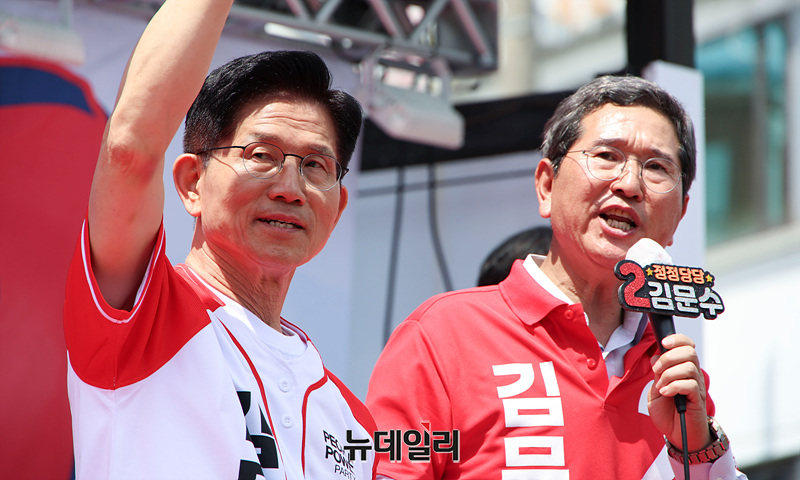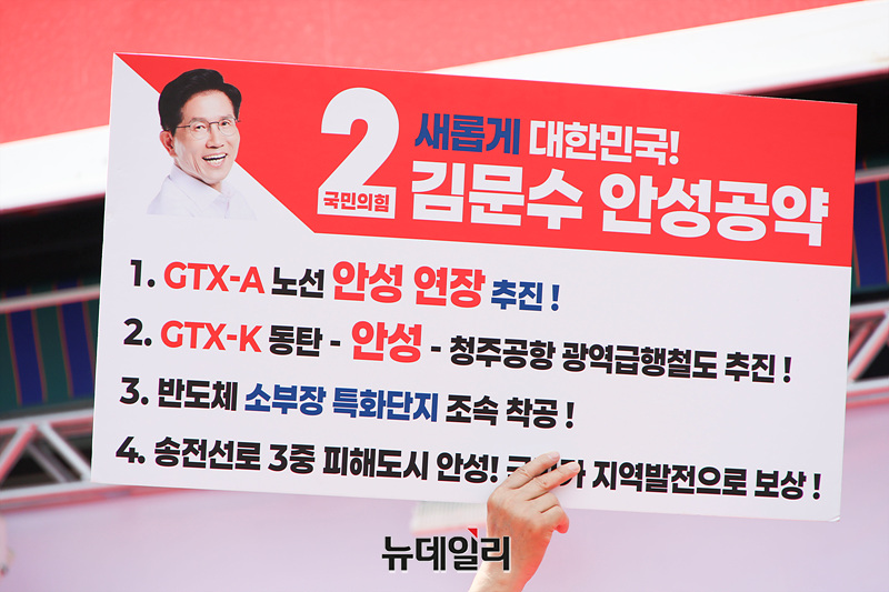 김문수 국민의힘 대선 후보가 6.3 대통령 선거를 앞둔 26일 오전 경기 안성중앙시장 서인사거리에서 열린 유세현장에서 안성시 공약이 적힌 판넬을 들고 있다.